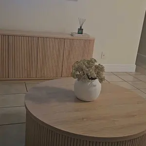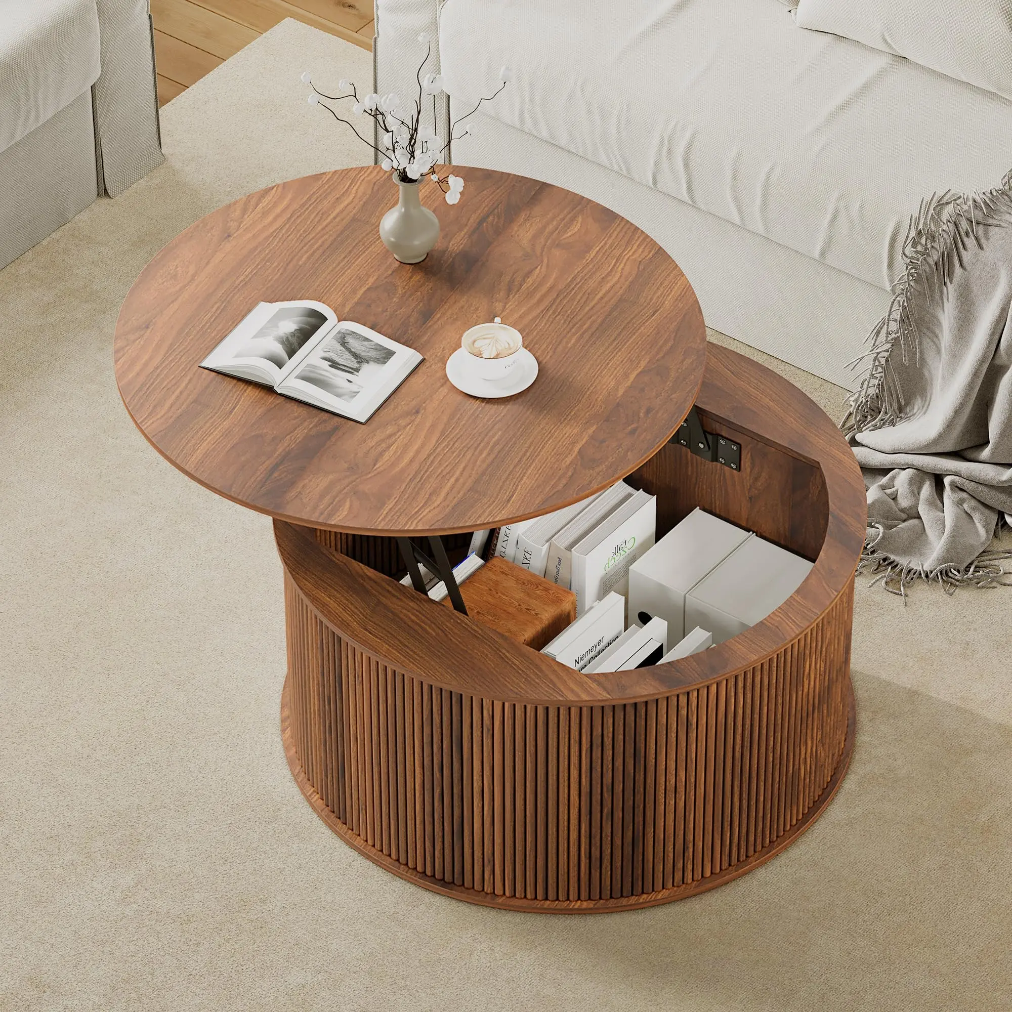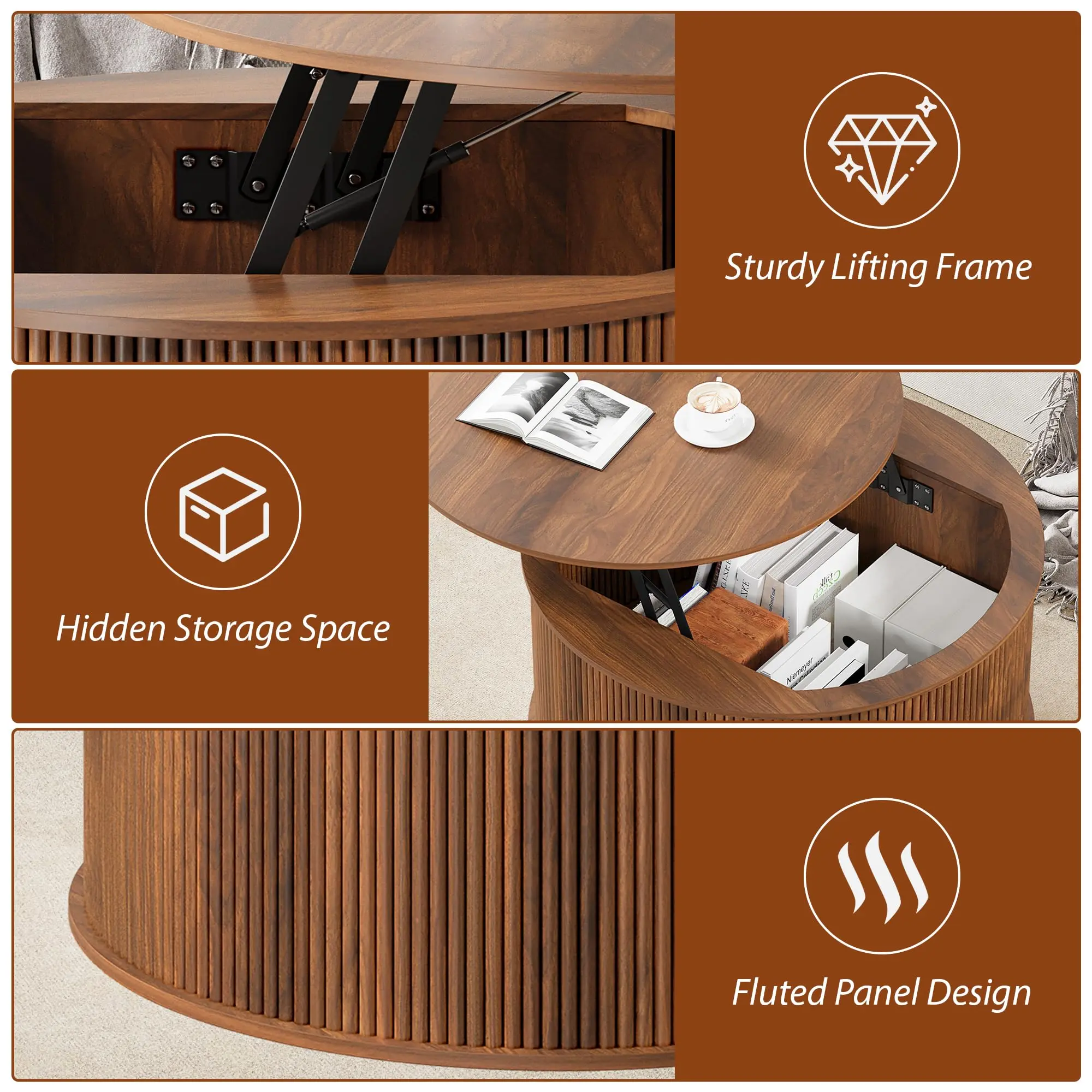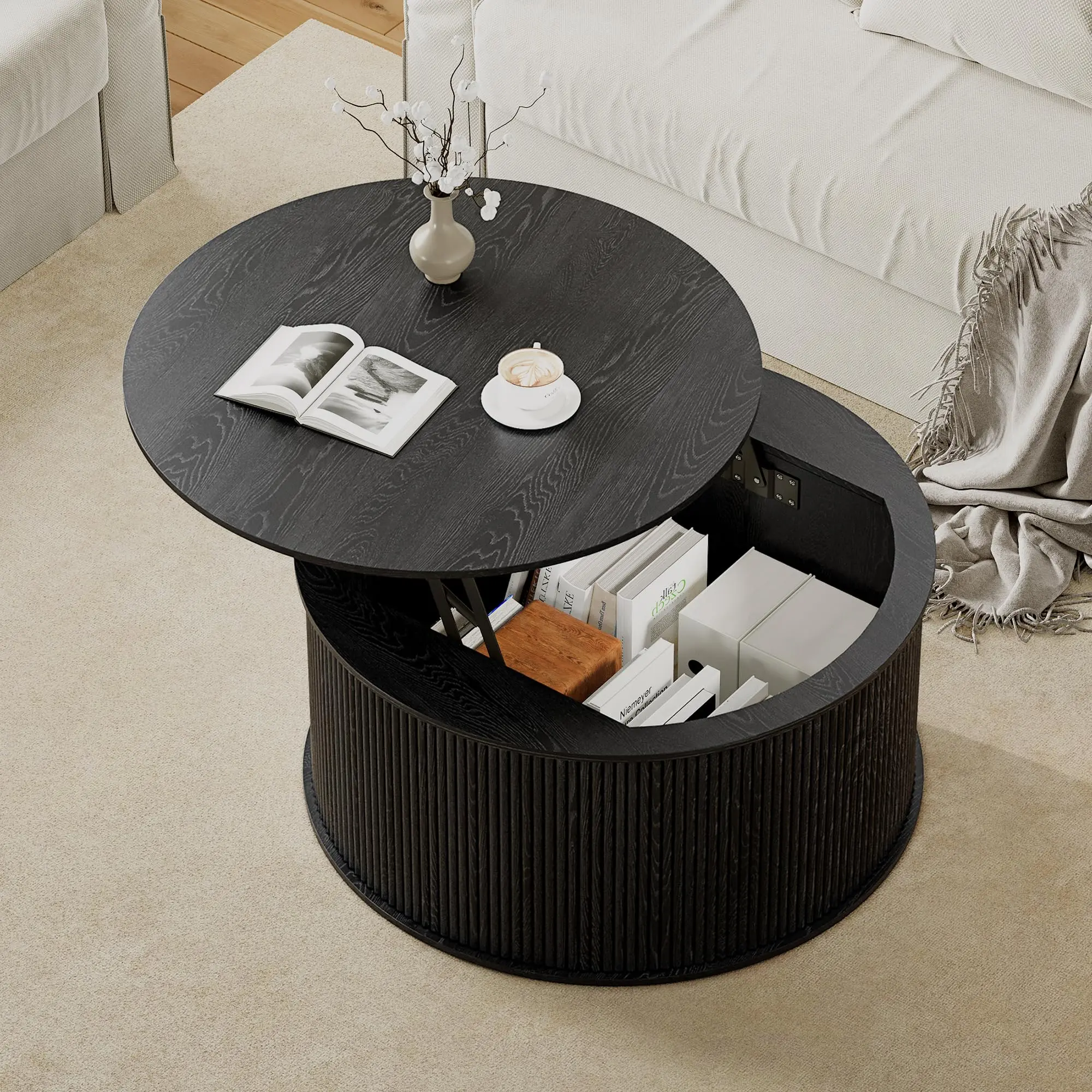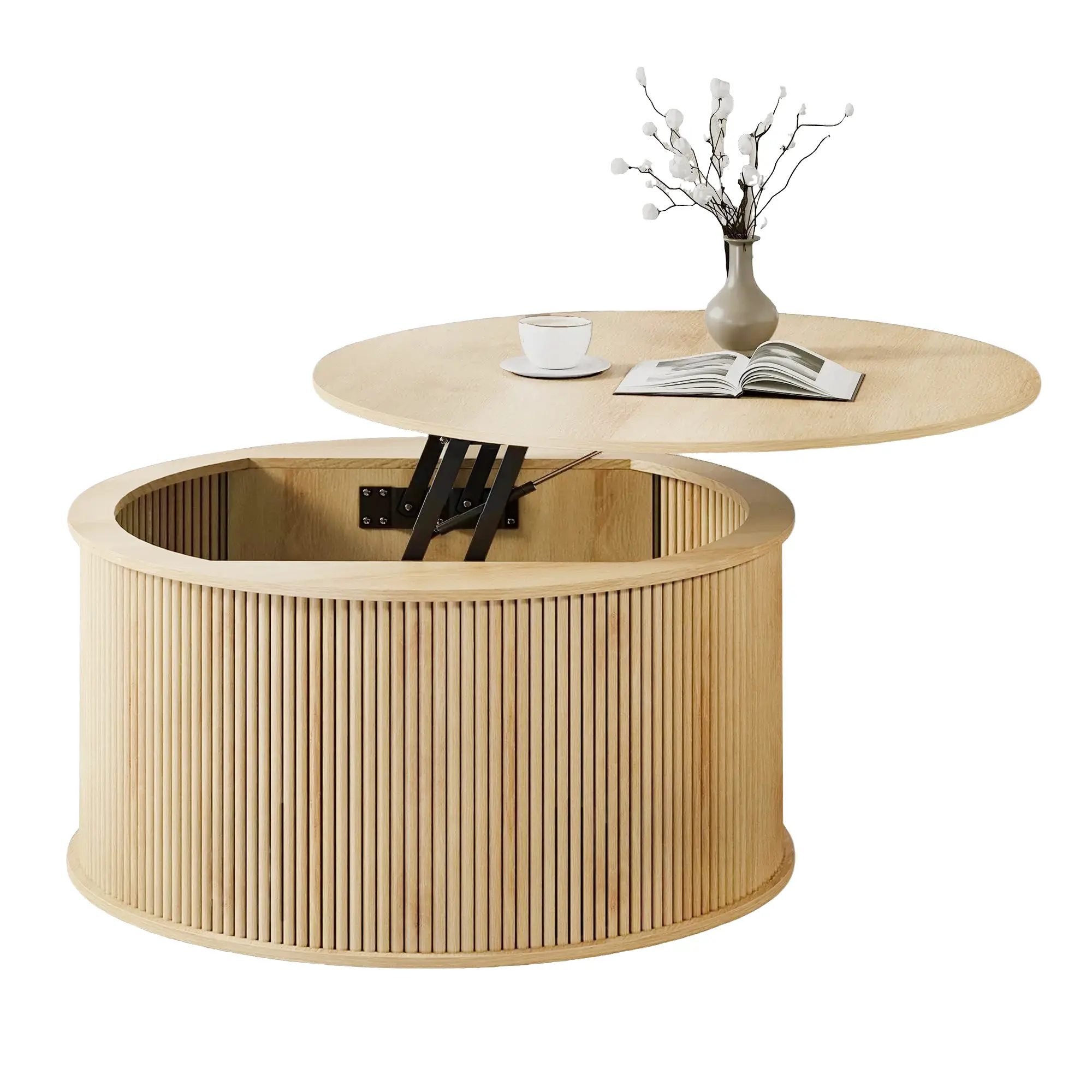 ·【Sturdy & Durable Material】 Crafted from high-quality engineered wood, this coffee table with storage is sturdy and durable enough to withstand daily use. The metal lifting mechanism and sturdy round base enhance the balance and stability of the tabletop, ensuring that you can use it without wobbling easily.