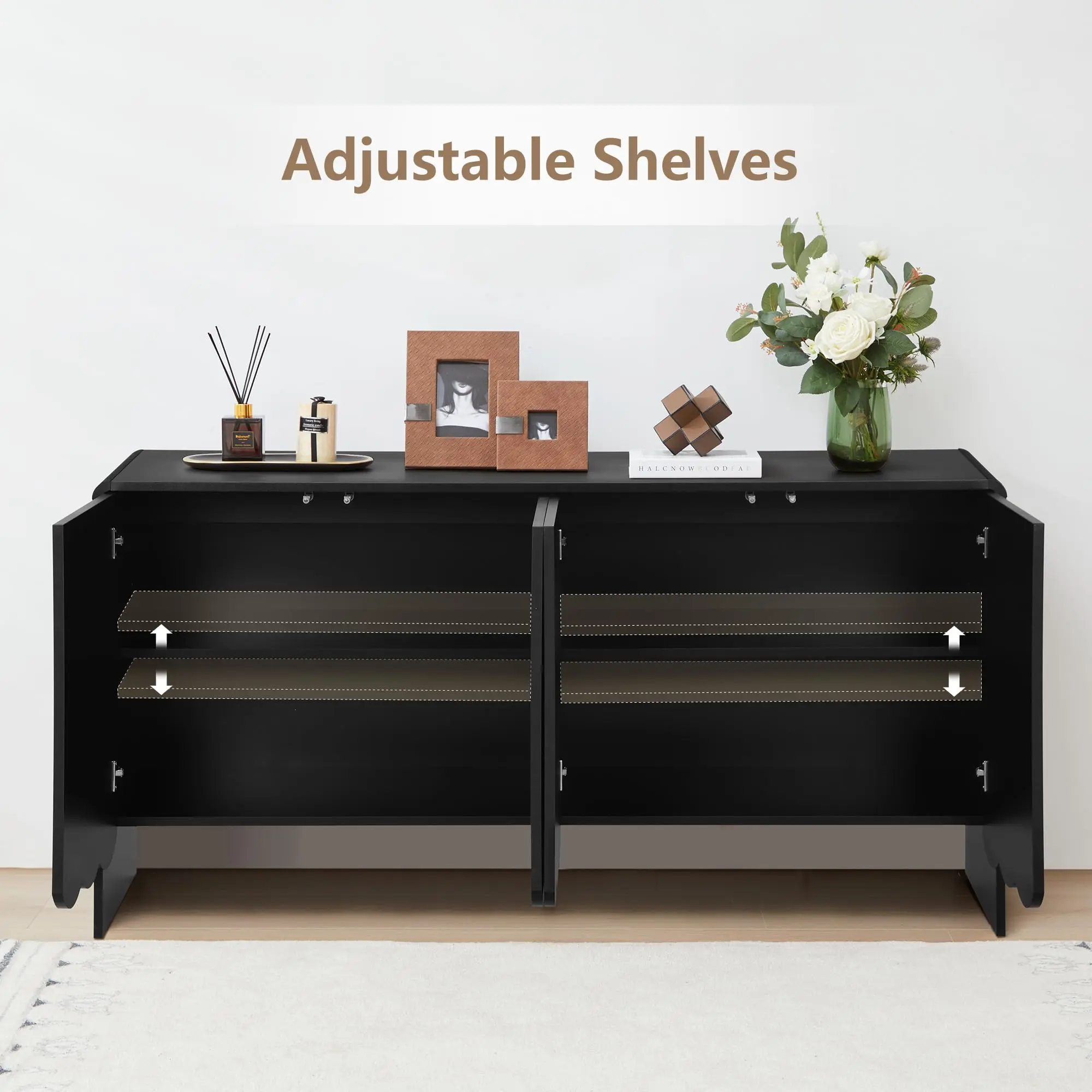 ·Modern Storage Cabinet: Elevate your living room's style with our uniquely designed buffet cabinet. Its wave-shaped door surface adds a touch of distinction, setting it apart from traditional sideboards. With a spacious 7inch clearance between the cabinet and legs, you can conveniently store small items like sweeping robots at the bottom. Upgrade your storage game with this modern marvel!