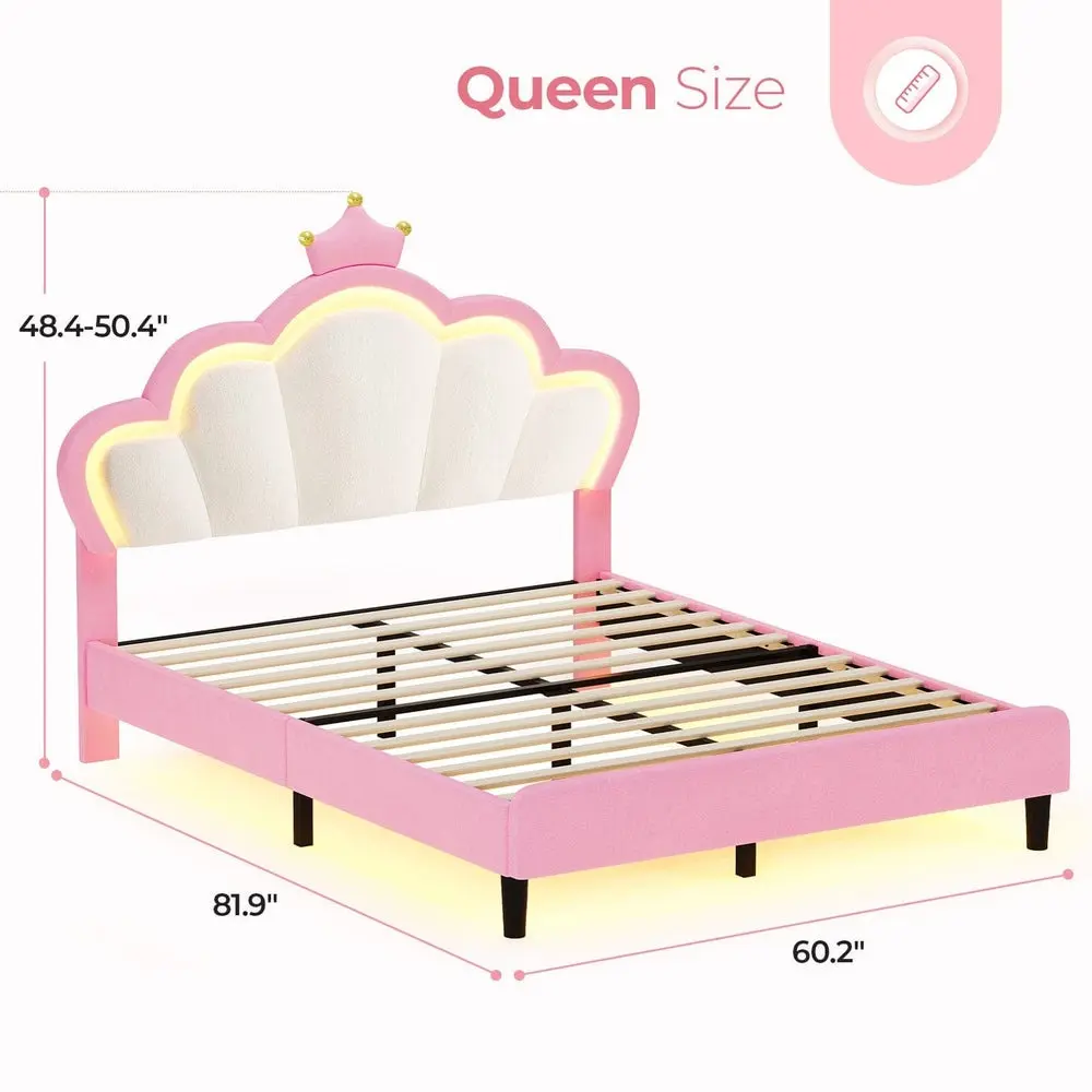 Experience luxurious comfort and elegance with this cute, soft girls queen bed. Adorned with velvet fabric and a fashionable princess crown headboard, it features a unique floral design integrated with LED lighting, making it both practical and ideal for creating a perfect princess-inspired bedroom.