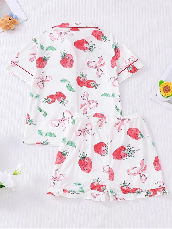 Girl's Bow Print Top & Shorts Pyjama Sets, Cute Casual Comfy Short Sleeve Top & Shorts Set, Kids Sleepwear for Summer, Pajama Set