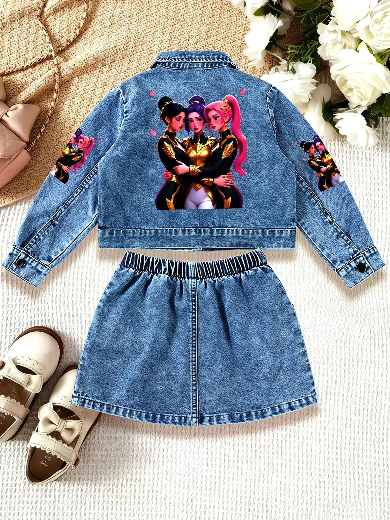 Girls' Cartoon Print Denim Jacket & Short Skirt Set, Casual Fitted Design #jeansjacket #jacketforbaby #deminjacketforkids #babyfashion #2pieceset