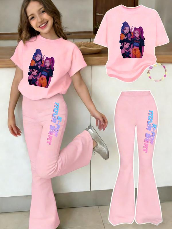 Girls' Kpop Print 2-Piece Set, Casual Sporty Short Sleeve Top & Bell Bottom Pants, Comfortable Elastic Waist, Spring Summer