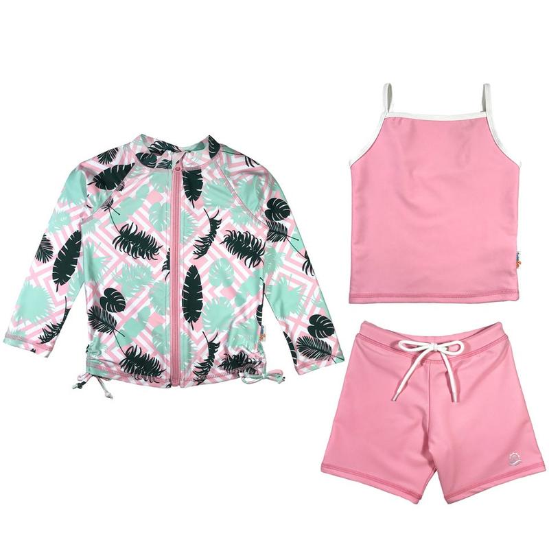 How great is this three-piece swimsuit set, complete with a long sleeve rash guard, tankini top and swim shorts?! The tankini has adjustable straps and the waist tie is fully adjustable, making this set a perfect option for always growing kiddos! They get the sun protection they need, while staying super comfy in this cute coordinating tankini set.
