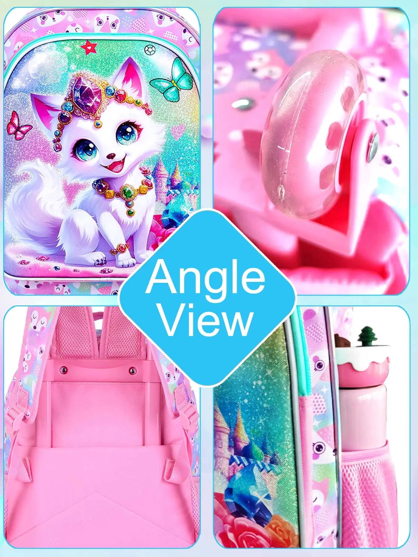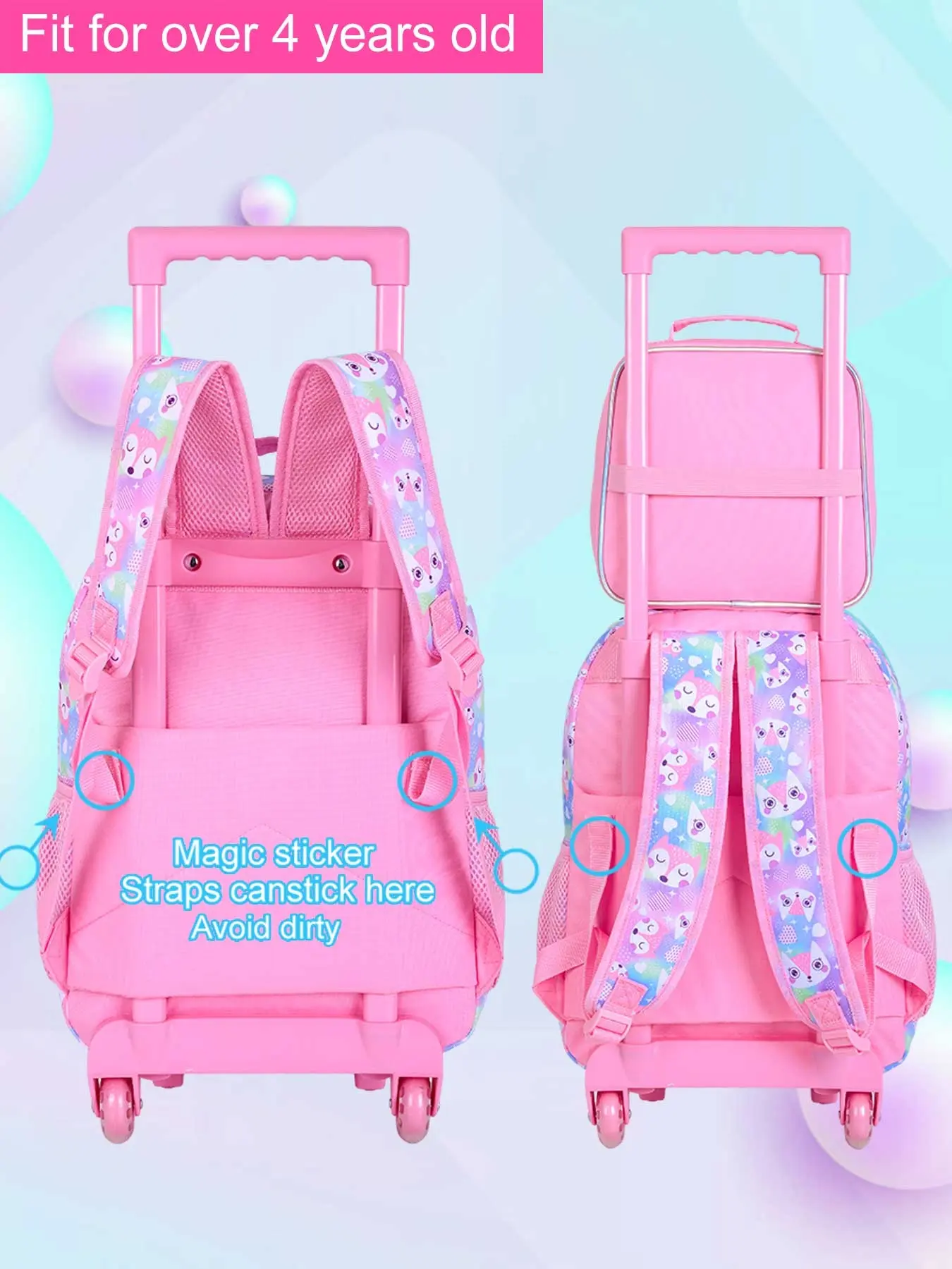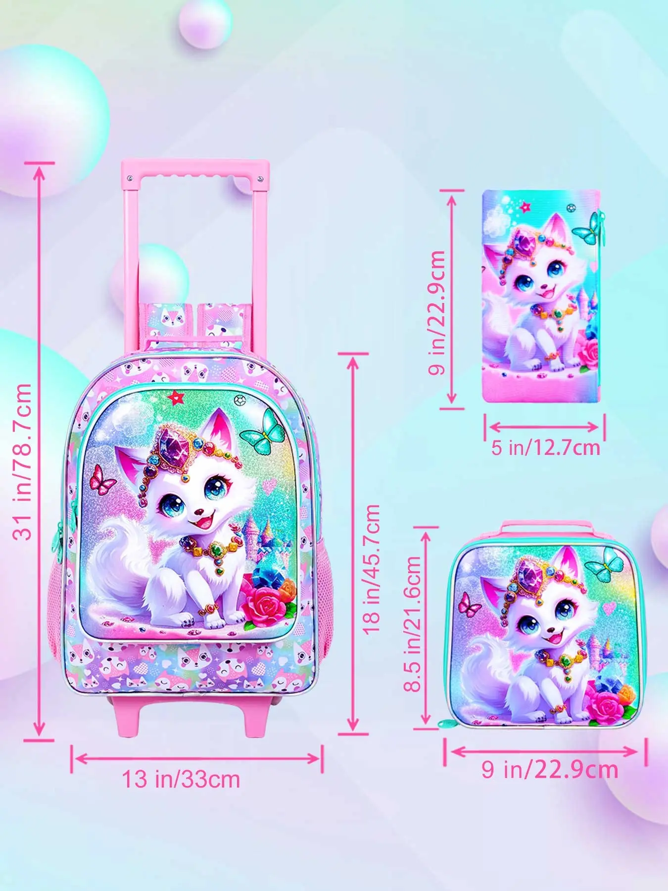 Girls' Rolling Backpack Set, Fox Pattern School Bag with Wheels, School Backpacks, Rolling Bookbag and Lunch Box for Preschool (white)