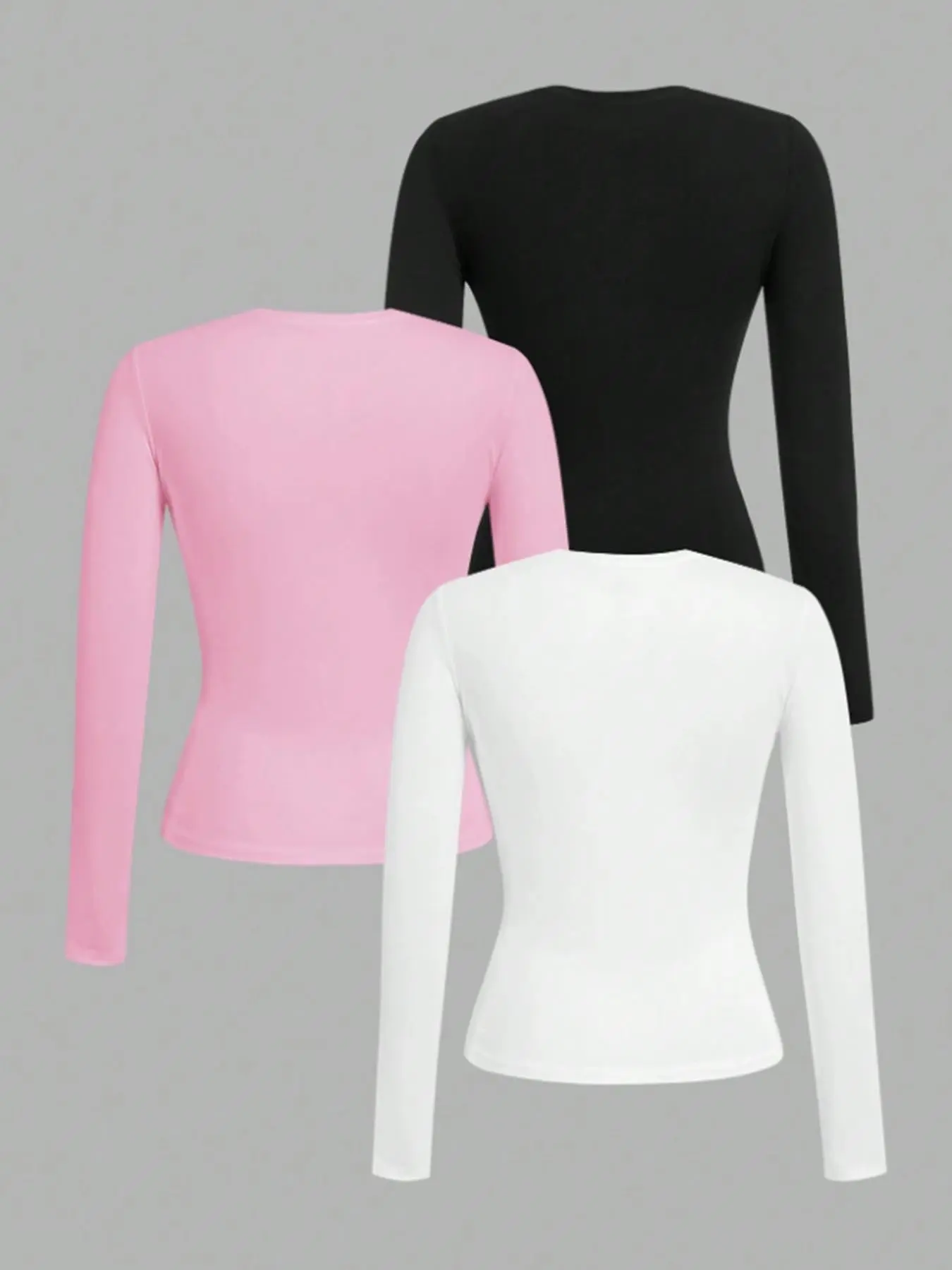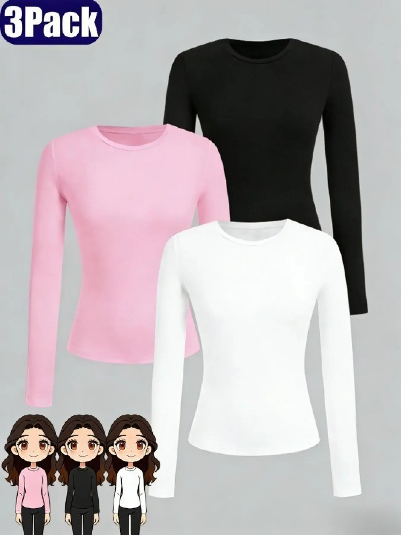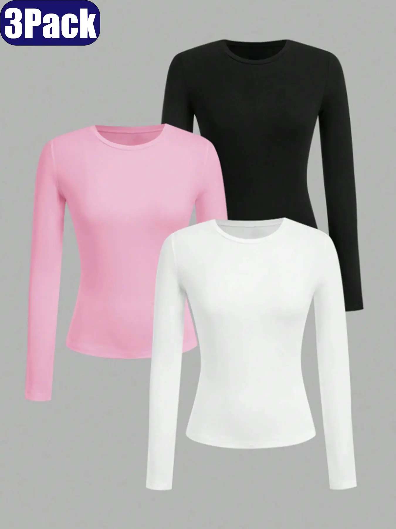 3-piece set of girls' solid color basic round neck knitted long sleeved T-shirt, slim and comfortable, machine washable, soft and skin friendly, Soft and gentle, practical for daily leisure, suitable for both school and outdoor use