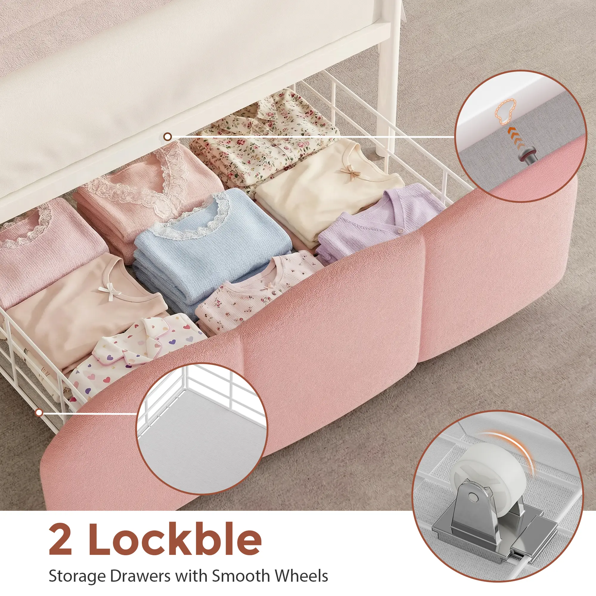 ·2 SLIDING STORAGE DRAWERS: This bed frame's dual sliding drawer design enhances practicality. These drawers not only store seasonal clothing and other items. Equipped with screw clips, you can easily secure these drawers under the bed to prevent slipping. It also has 10.4 inches height clearance underneath for easy access by robot vacuums and provides storage space for small suitcases, making it perfect for small apartments