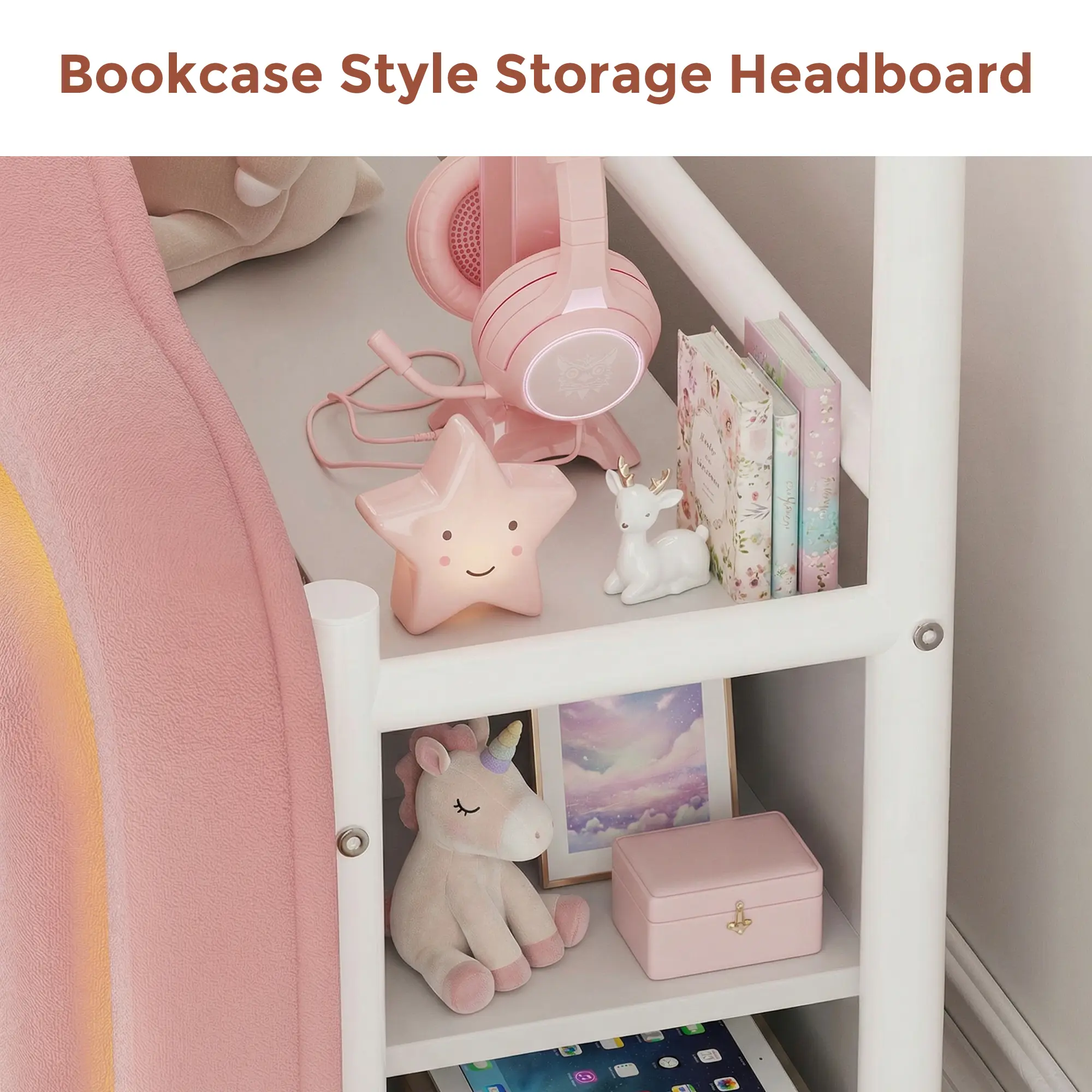 ·CHARGING STATION & 2-TIER HEADBOARD STORAGE: The headboard is equipped with a built-in charging station, including 2 AC Outlets, a USB port and a type-C port, ensuring uninterrupted play and learning. 2-Tier Storage shelf on the headboard can provide more storage space, making it convenient for kids to place kids' essentials such as story books, pads, alarm clocks, etc