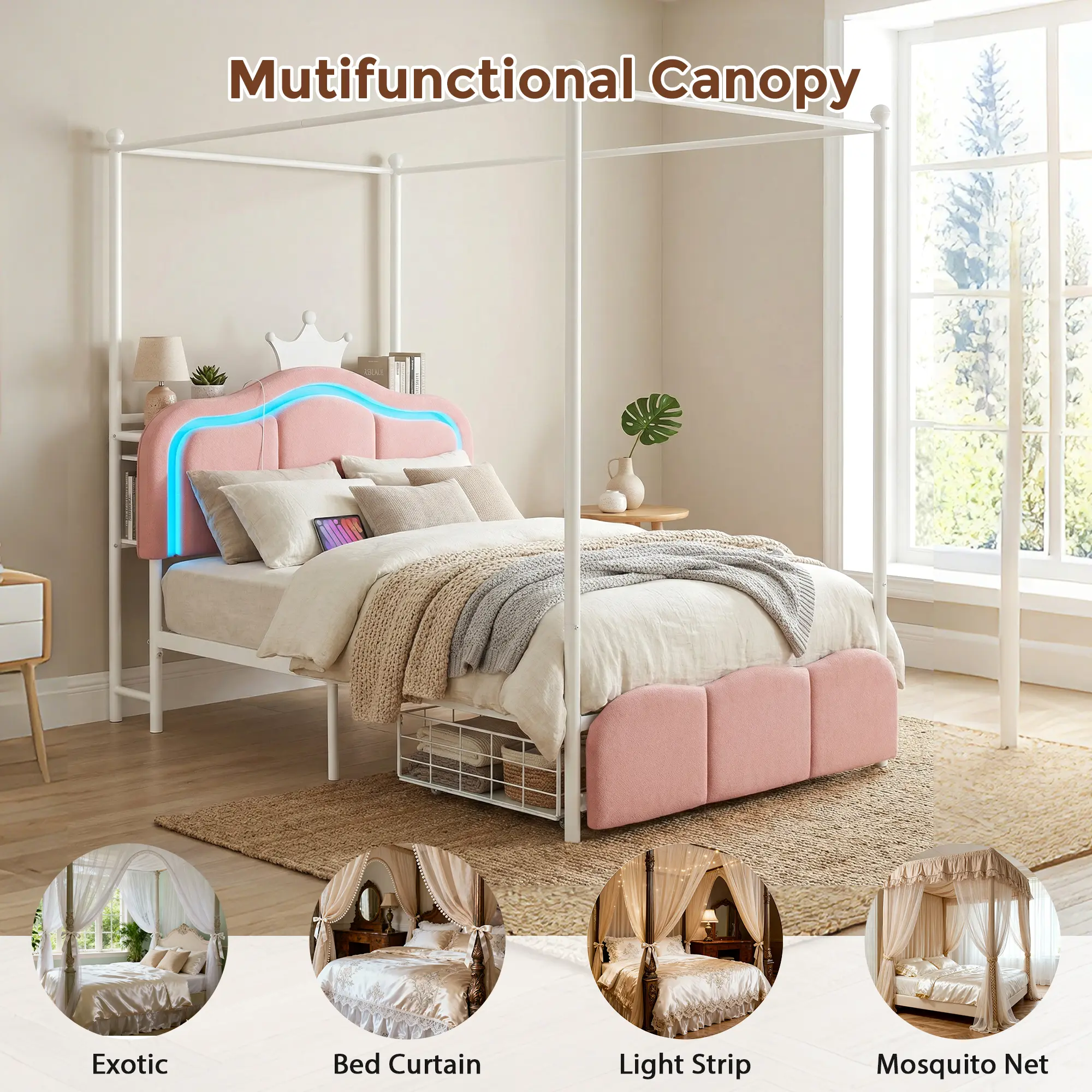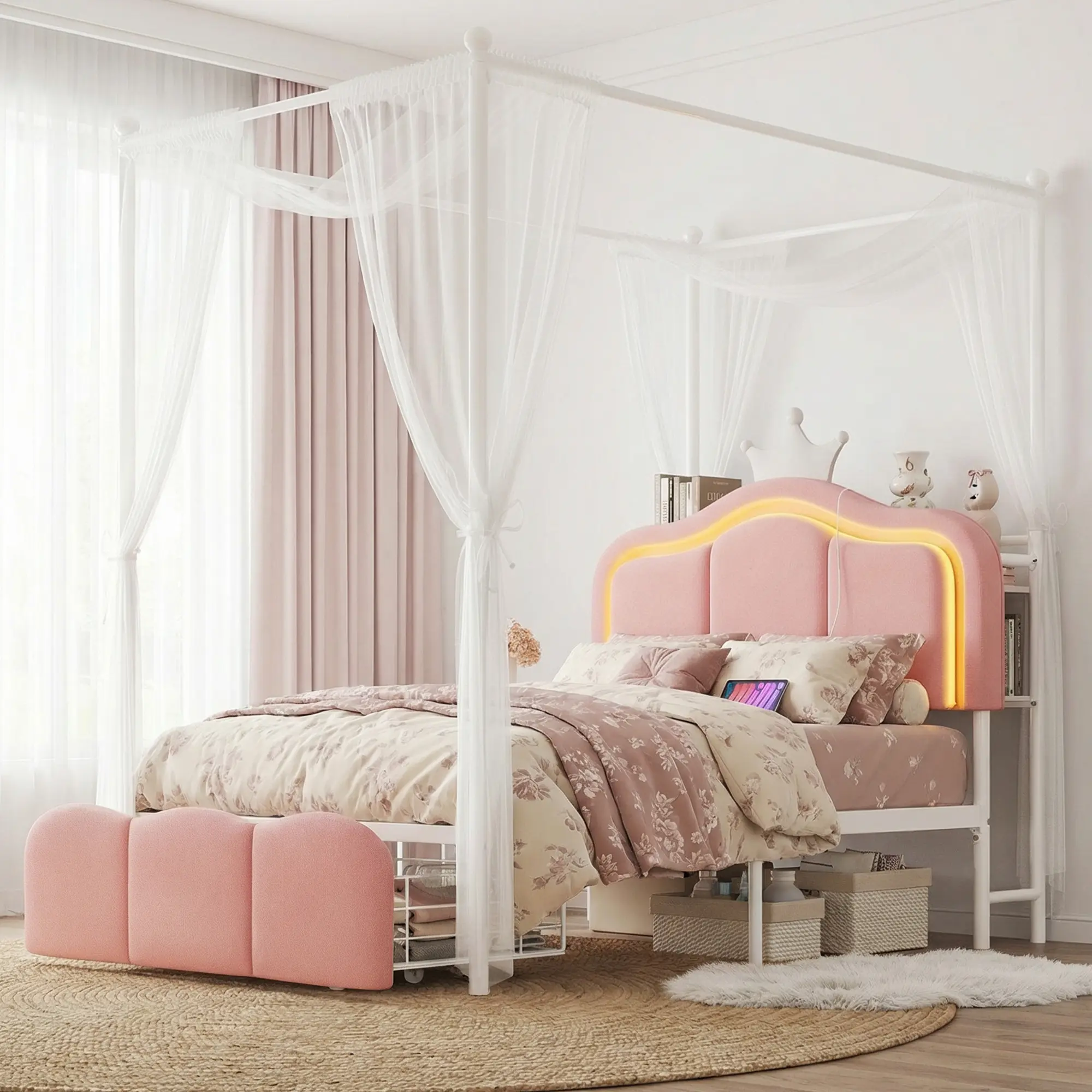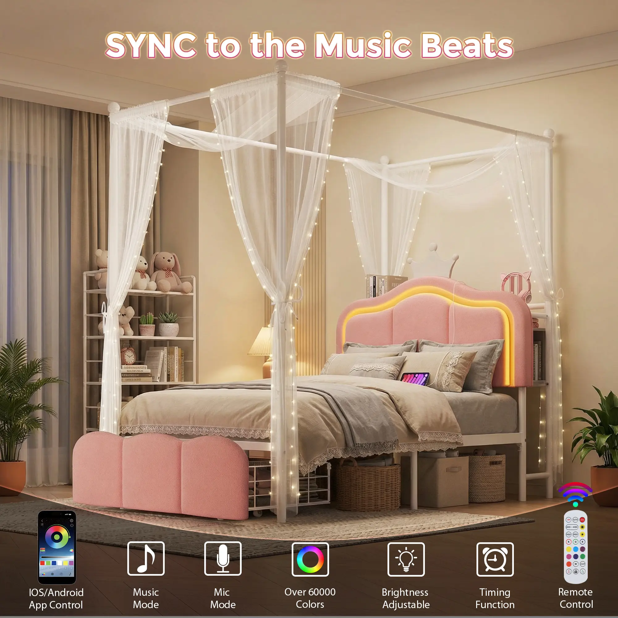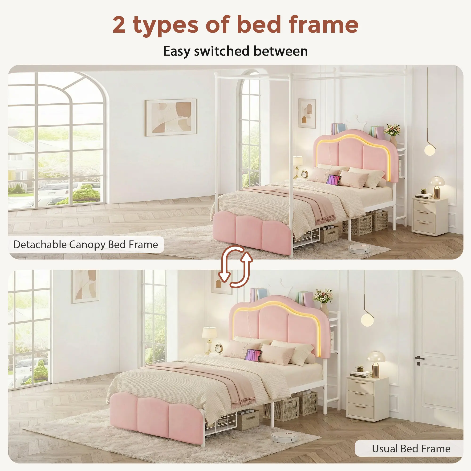 ·SMART RGB LIGHTING SYNCS WITH MUSIC: This twin-size canopy bed frame features a built-in RGB LED headboard with over 16 million colors, over 20+ light effects, and dynamic modes controlled by app or remote. Transform your bedroom with vibrant lighting that syncs to music, creating the perfect ambiance for relaxation, reading, or entertainment. Over 100,000 hours of lighting lifespan ensures lasting companionship for every comfortable night