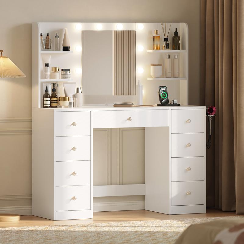 Vanity Desk brings elegance and functionality to your bedroom. This dressing table boasts 9 drawers and 6 storage shelves, ideal for organizing essentials. The power outlet and 3 color modes enhance your vanity setup. The 10 LED bulbs provide ample lighting for your dressing routine. Perfect for girls' bedrooms, this desk combines style with practicality.
