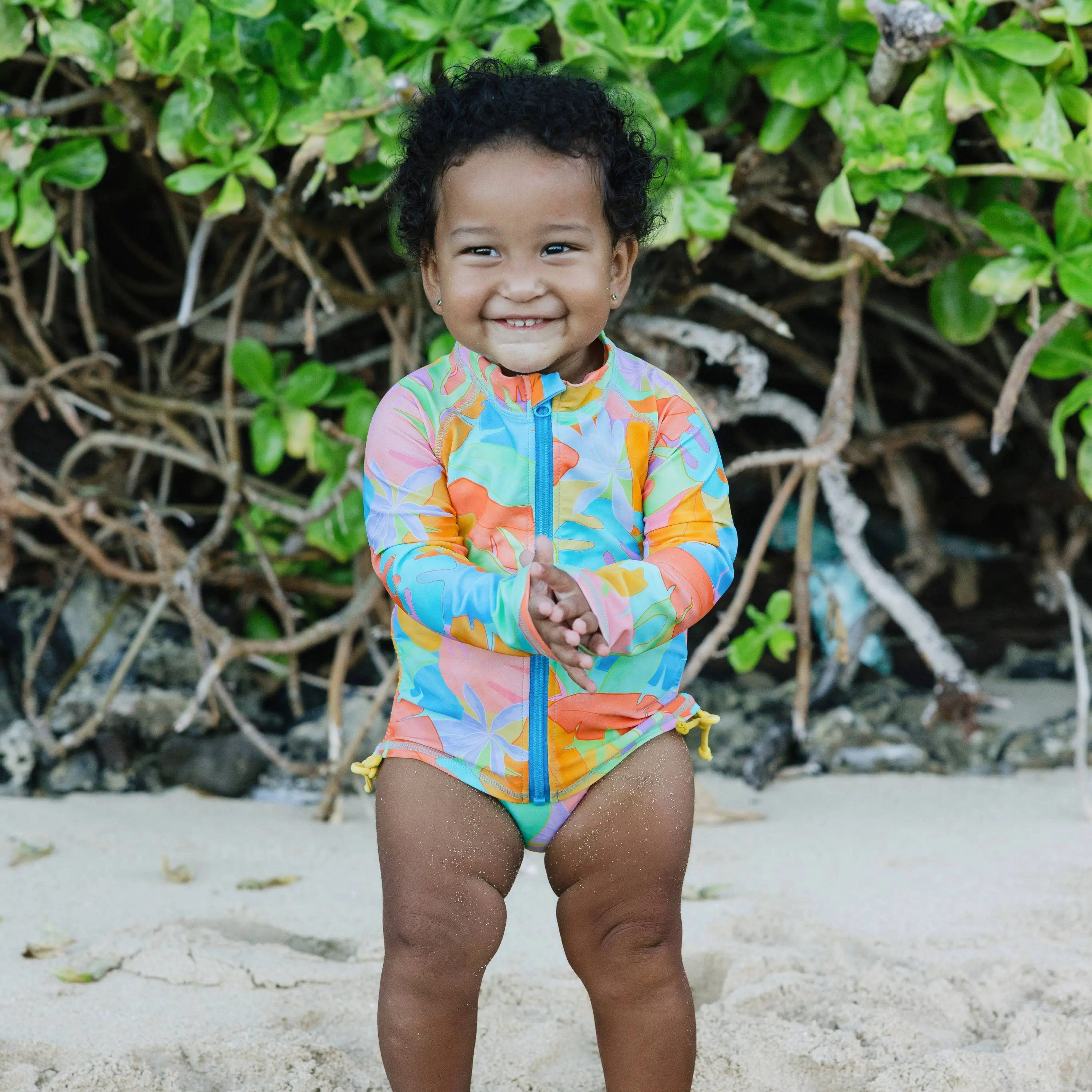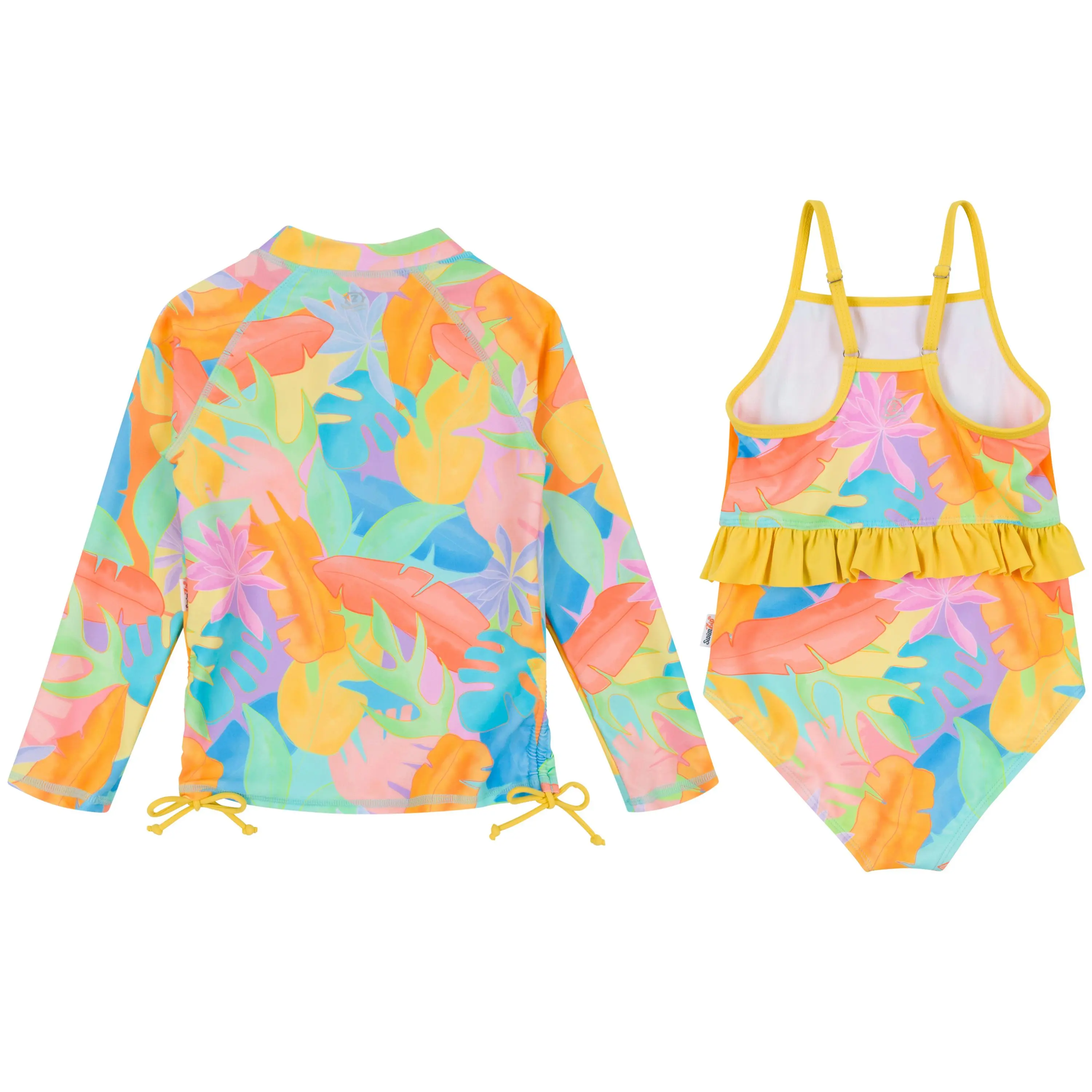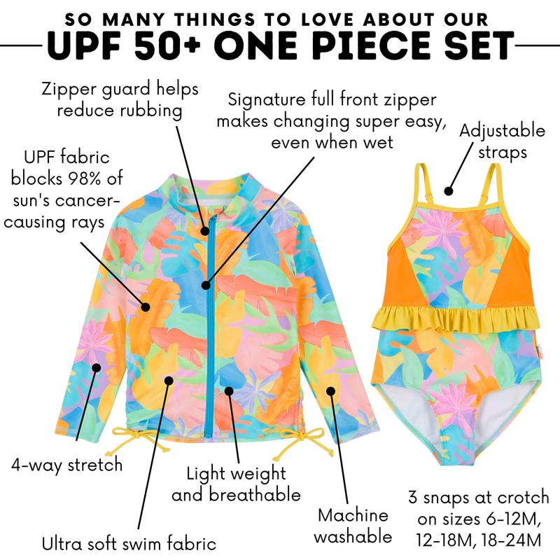 This one-piece swimsuit and long sleeve rash guard set is the perfect sun safe combo! Check out the cute color blocking and ruffle detail, and adorable coordinating rash guard. Swim jacket is great to toss on during those peak UV hours for extra sun protection.