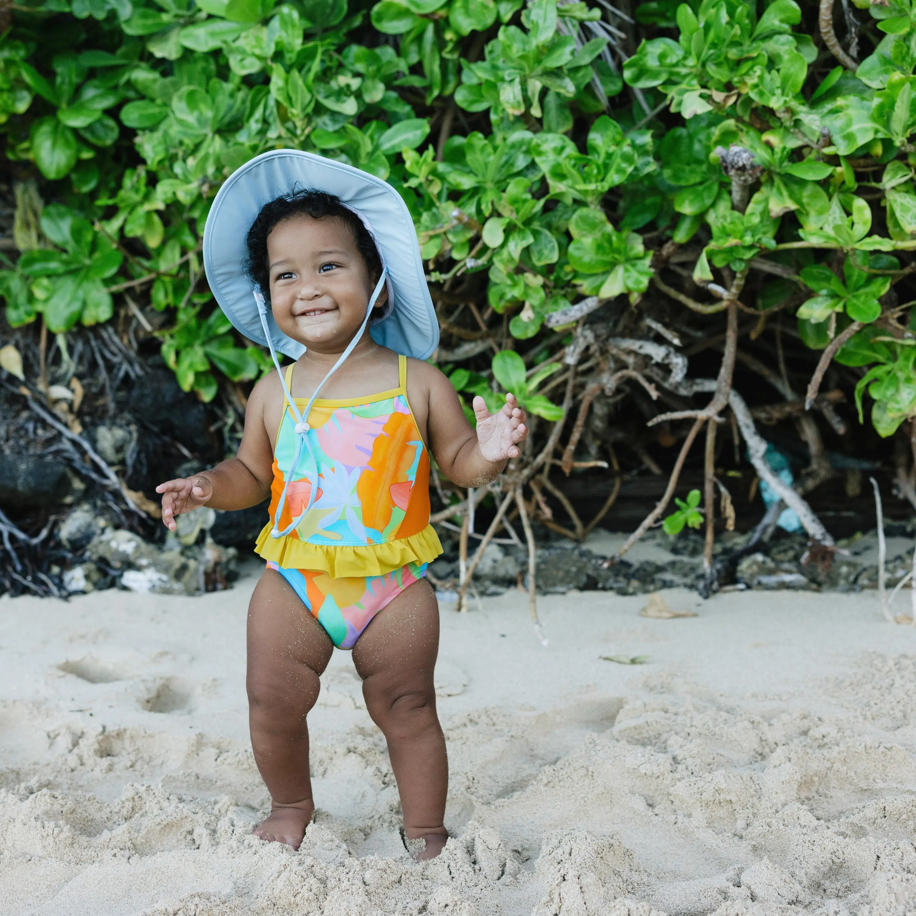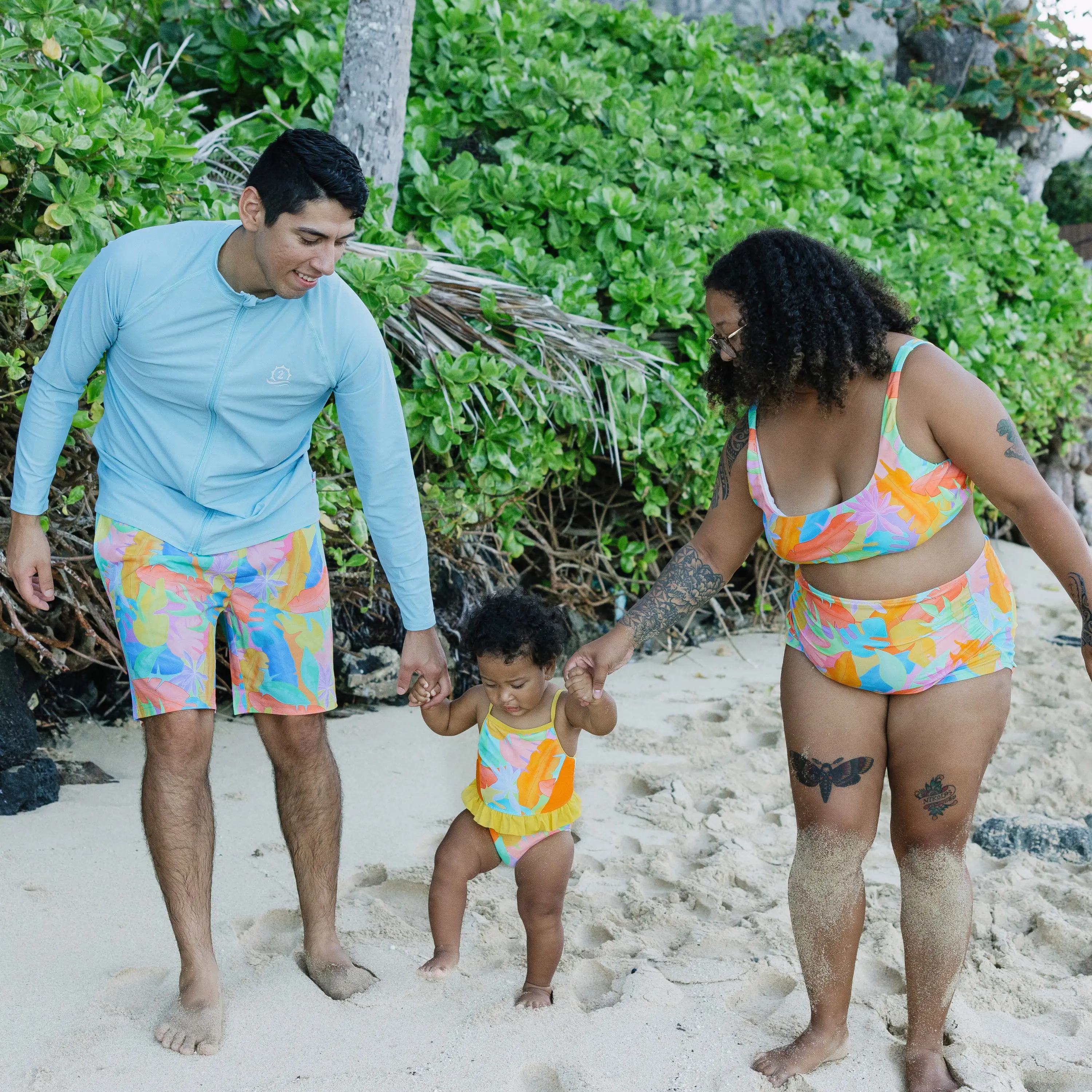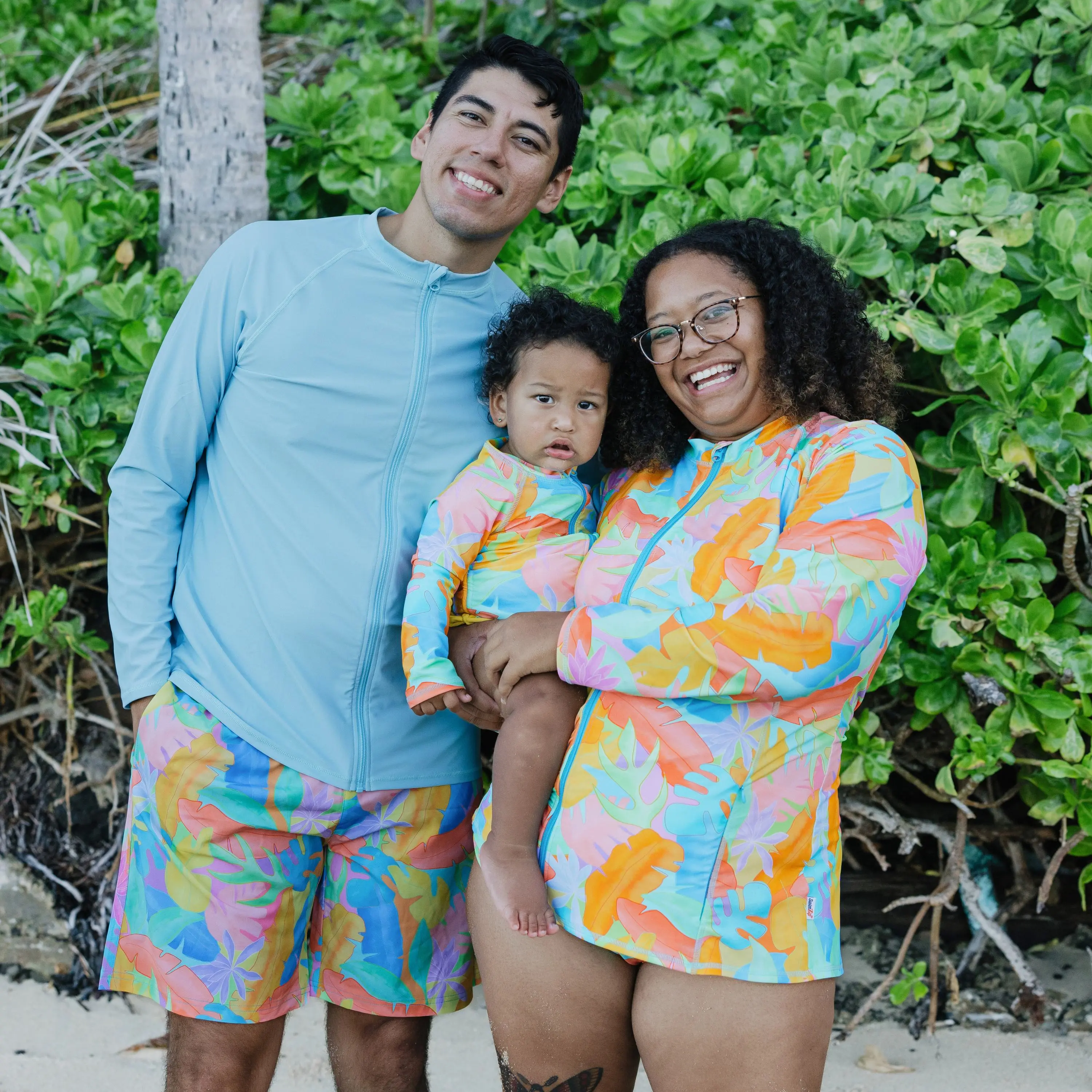 This one-piece swimsuit and long sleeve rash guard set is the perfect sun safe combo! Check out the cute color blocking and ruffle detail, and adorable coordinating rash guard. Swim jacket is great to toss on during those peak UV hours for extra sun protection.