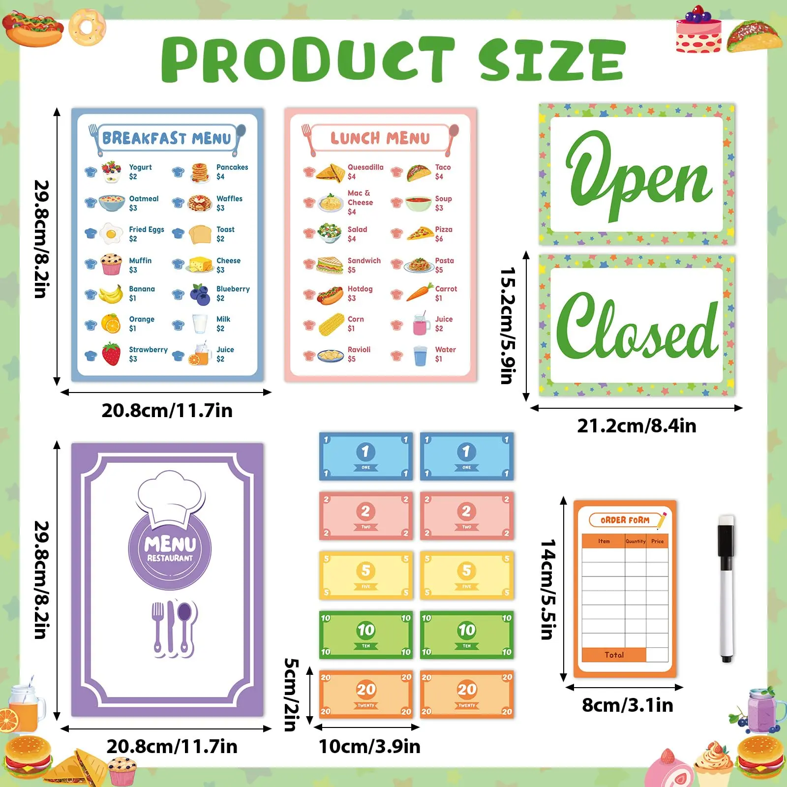·Proper Size for Play: The pretend play restaurant menu measures about 8.19 x 11.73 in (20.8 x 29.8 cm) and is printed with a wide variety of food and drinks. The receipt book is 5.51 x 3.15 in (14 x 8 cm). The open/close sign is 8.35 x 5.98 in (21.2 x 15.2 cm). The play money measures 1.97 x 3.94 in (5 x 10 cm). The restaurant role-playing set is the great size for kids and bring extra fun to role-playing.