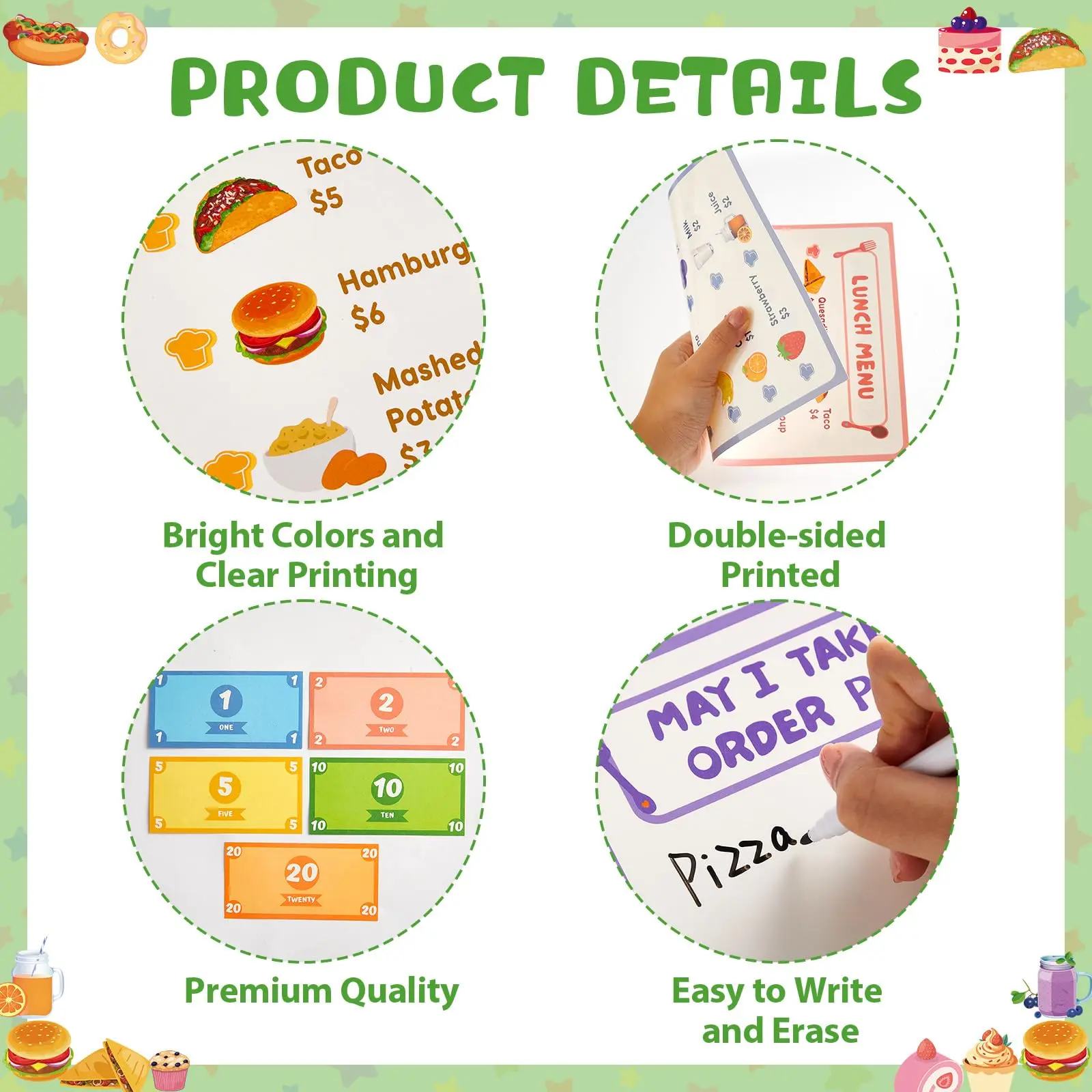 ·Pretend Play Restaurant Menu Set: This set includes 4 pretend restaurant menus for kids—2 double-sided customer menus (1 breakfast & lunch, 1 dinner & dessert), 1 server menu, 1 guest check notepad with 30 pages, 1 open/close sign, 30 pieces of play money ($1×6, $2×6, $5×6, $10×6, $20×6), and 1 erasable black ink pen. It gives kids the chance to role-play, take orders, and enjoy dynamic pretend play experiences.