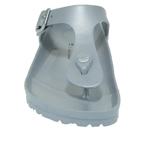 Birkenstock Gizeh Essentials EVA Metallic Thong Sandal Make a splash at the beach or poolside wearing this colorful, water-friendly sandal. They're made with the same Birkenstock contoured footbed you know and love, only it's all part of the waterproof EVA design.