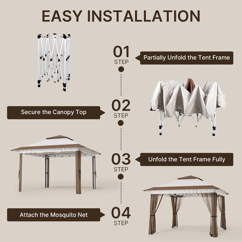 ·This pop-up canopy features four zippered mosquito net walls that can be easily attached or removed, making it the perfect addition to any outdoor space—from backyards and patios to poolside gatherings and garden parties.