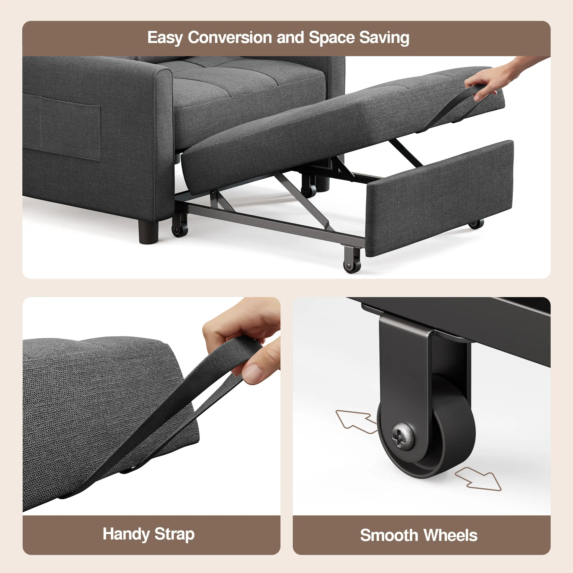·3-in-1 Conversion Design: The Gizoon sofa bed easily transforms into a seat, sofa bed, or lounge chair. Its pull-out design includes removable wheels for easy setup. With a minimalist style, it complements any home décor