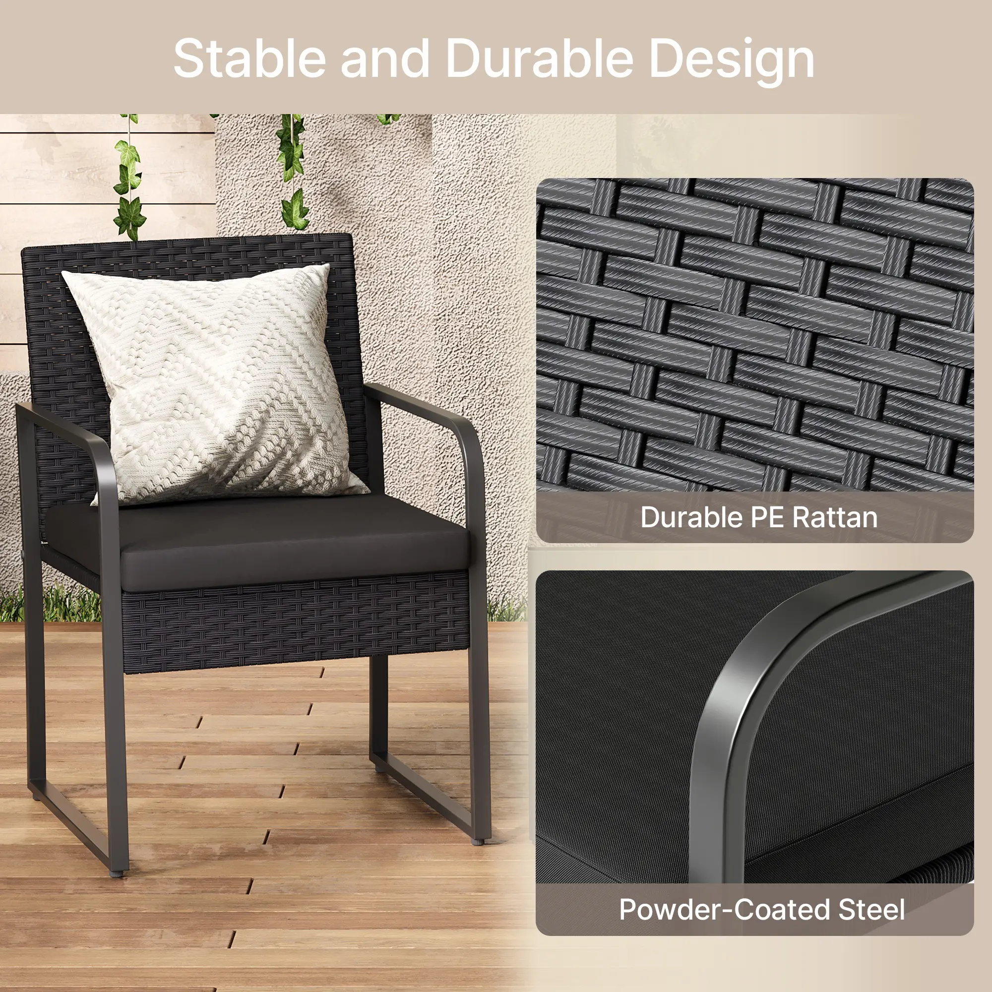 ·Stable and Durable: This 3-piece patio bistro set features a powder-coated steel frame that offers strong support and rust resistance. The all-weather PE rattan is lightweight, fade-resistant, and has good load-bearing capacity