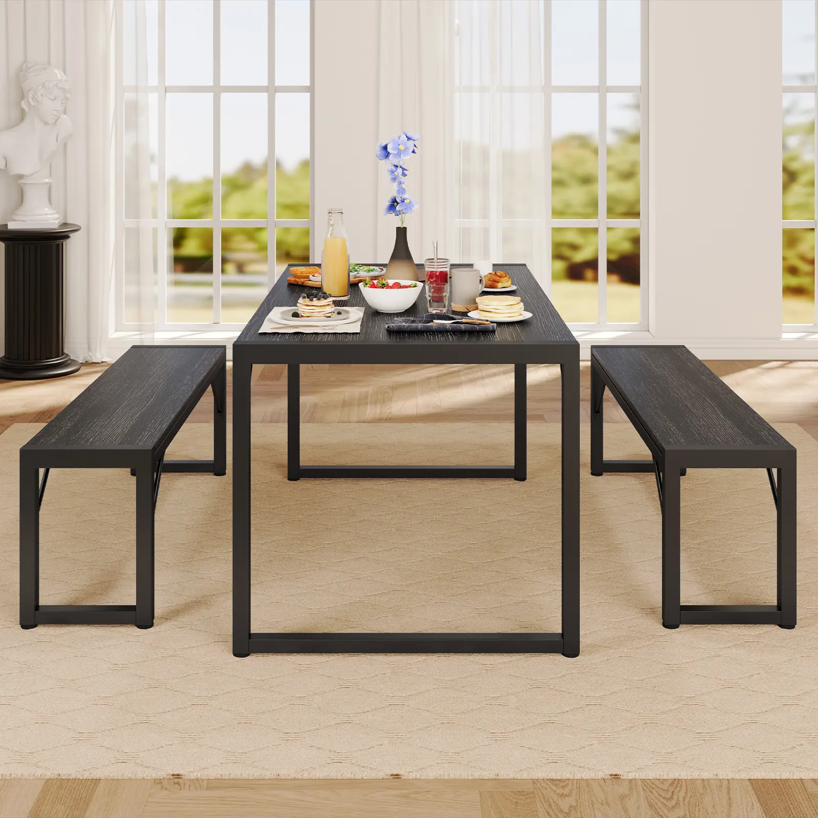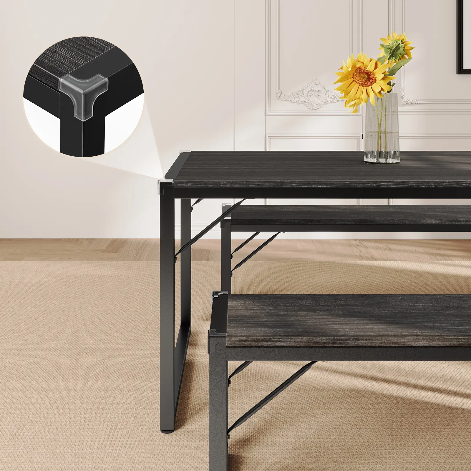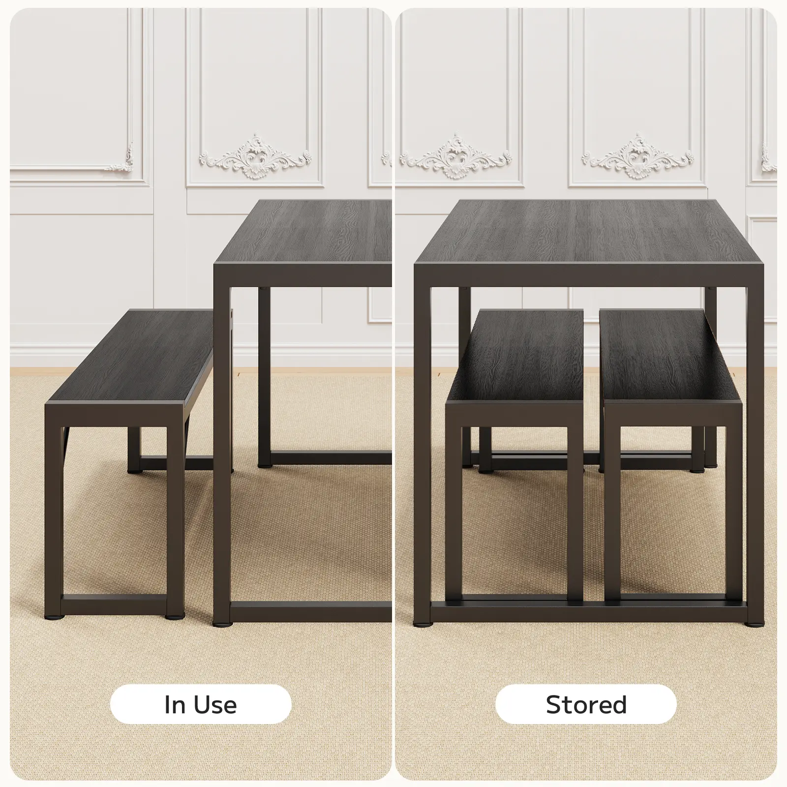 ·Space-Saving Design: This kitchen dining table with benches is designed to minimize storage space. The benches conveniently slide under the table, optimizing space and reducing trip hazards. It is an excellent choice for small condos, kitchens, and studio apartments