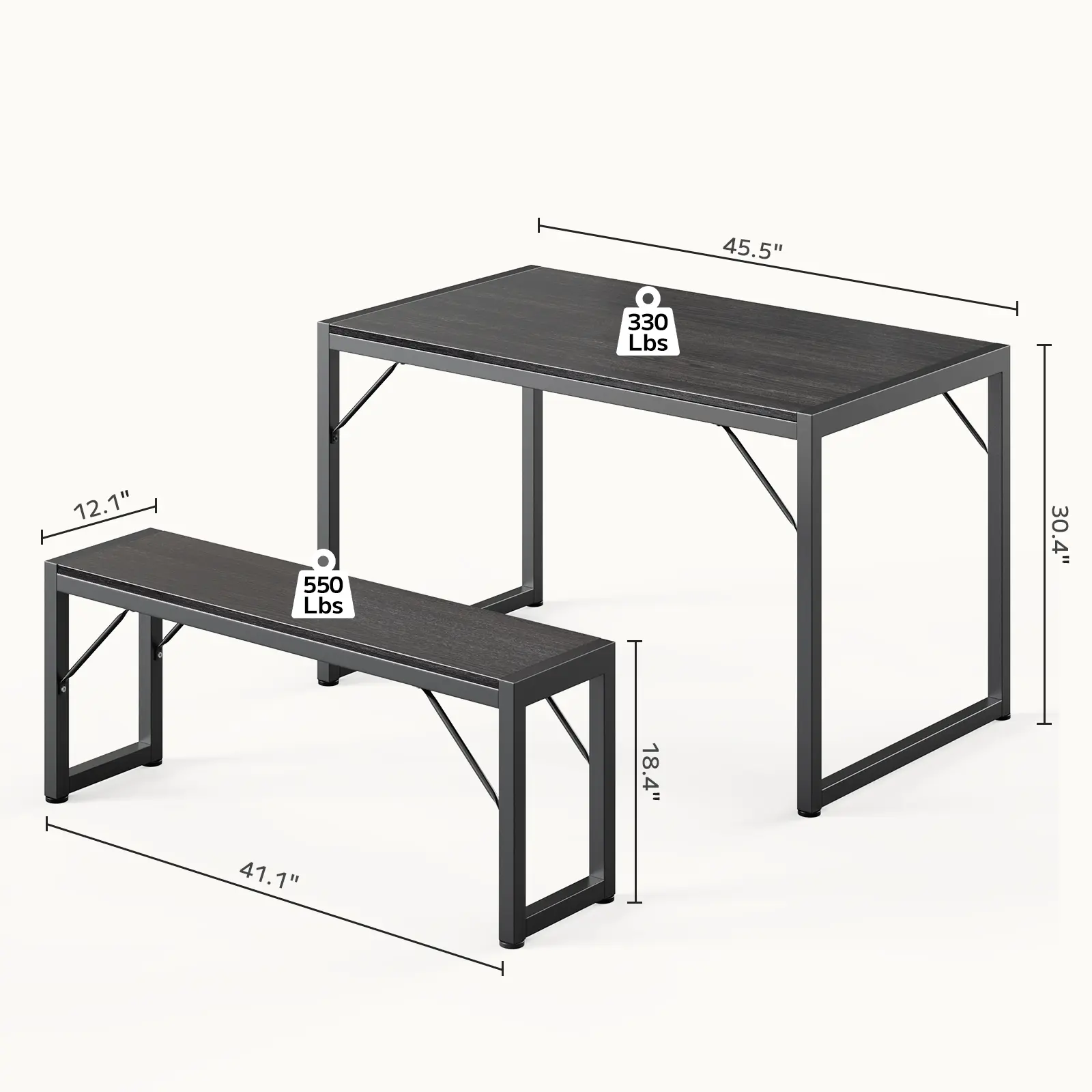 ·Dining Table Set for 4: Kitchen table with bench includes a spacious table (45.5" L x 30.4" W x 30.1" H) and two ergonomic benches (41.1" L x 18.4" W x 12.1" H), comfortably accommodating four people. Each bench has a weight capacity of up to 550 lbs, while the table supports up to 330 lbs