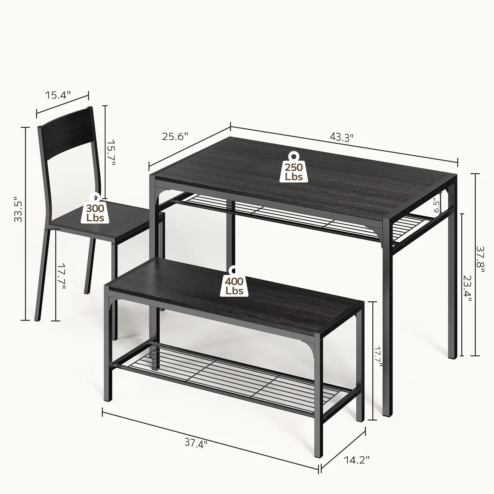 ·Product Specifications: Table Dimensions: 43.3" x 25.6" x 30"; Weight Capacity: 250 lbs Chair Dimensions: 15.4" x 15.4" x 33.5"; Weight Capacity: 300 lbs each Bench Dimensions: 37.4" x 14.2" x 17.7"; Weight Capacity: 400 lbs Package Includes: 1 table, 2 chairs, and 1 bench
