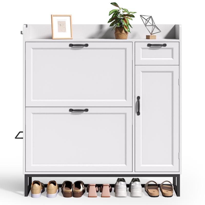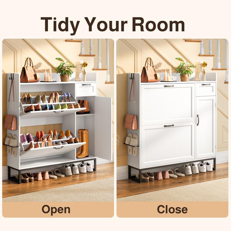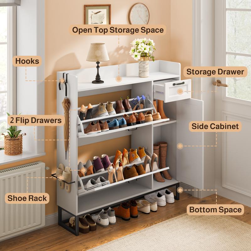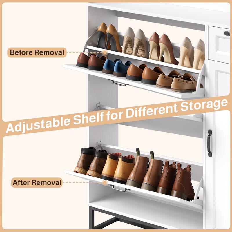 ·Versatile Storage Solutions: Features adjustable partitions in flip drawers and side cabinets. Perfect for different shoe types, from sneakers to long boots, meeting diverse storage needs