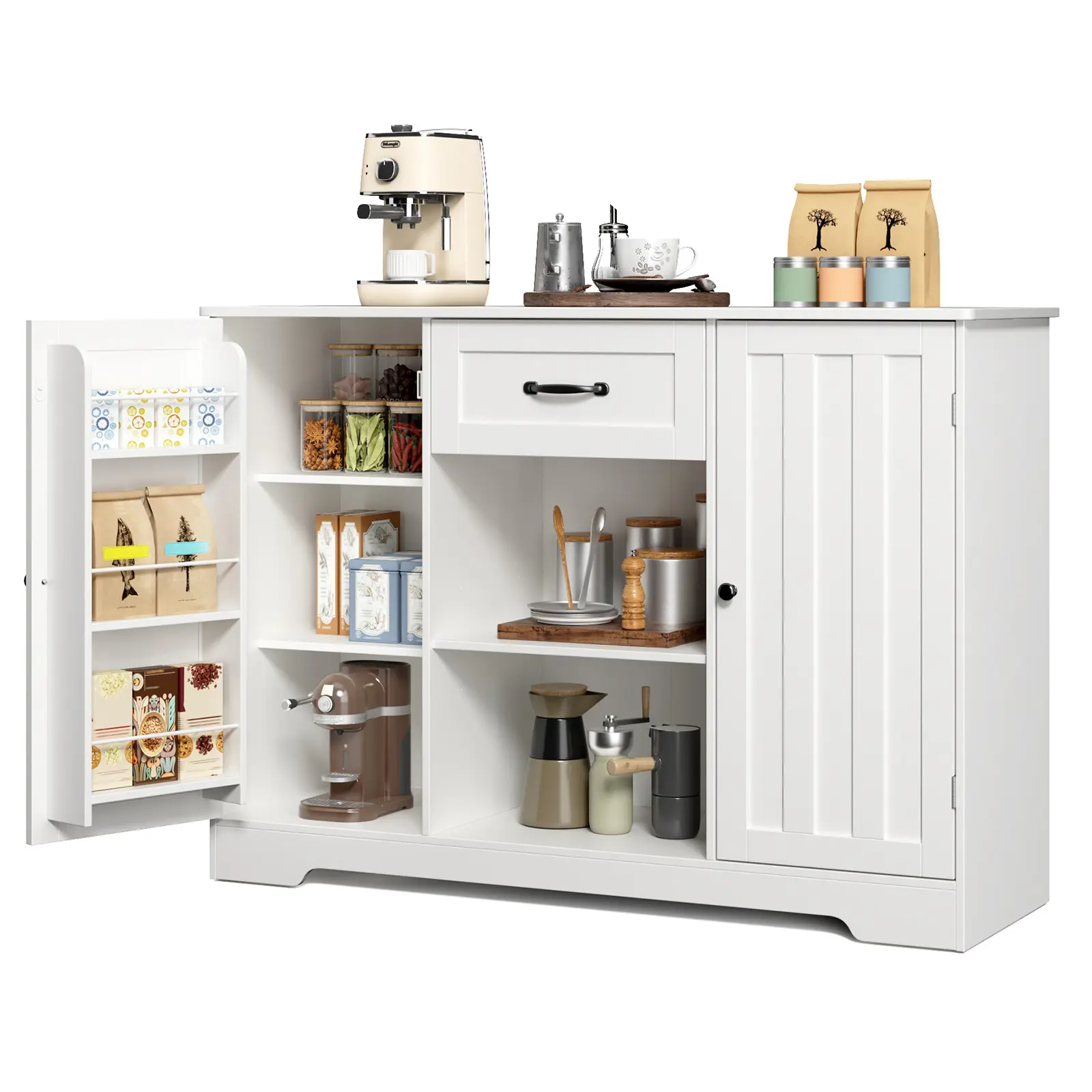 ·Large Storage Capacity: Gizoon coffee bar cabinet offers plenty of space for various items. The spacious tabletop is great for holding your coffee pot, coffee maker, and grinder. Inside the side door, you’ll find extra storage shelves, perfect for canned goods. The drawer is ideal for easy access to sandwich bags and napkins, while the bottom cabinet provides ample storage for items like boxed milk, nuts, and cookies