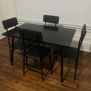 ·【Stylish & Modern Design】Elevate your dining space with this chic 5-piece dining set. Featuring a smooth woodgrain tabletop and sleek black metal legs, this set combines modern aesthetics with timeless elegance—perfect for kitchens, apartments, dorms, or even home offices