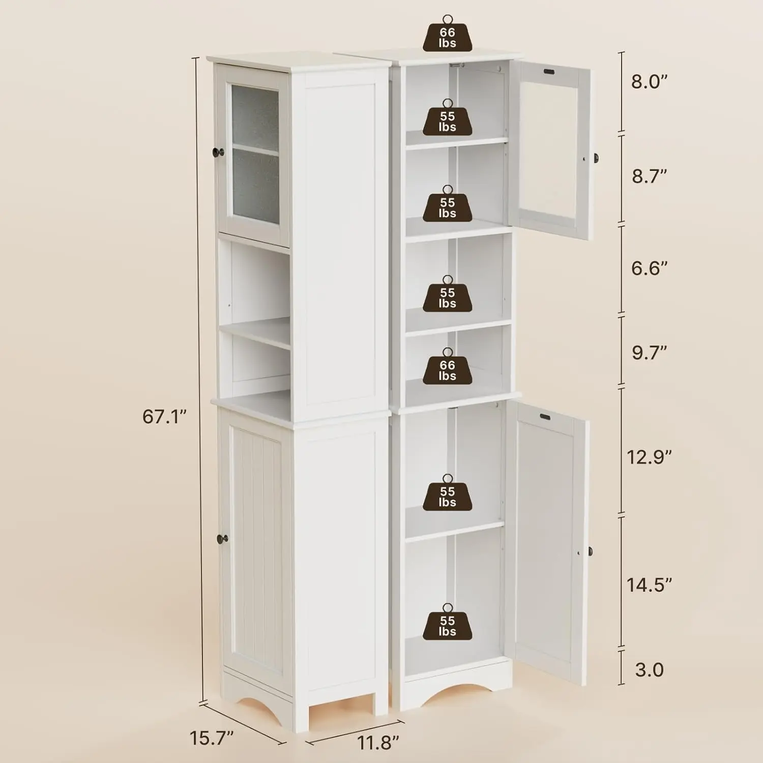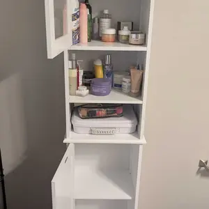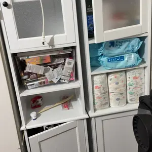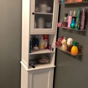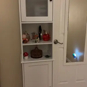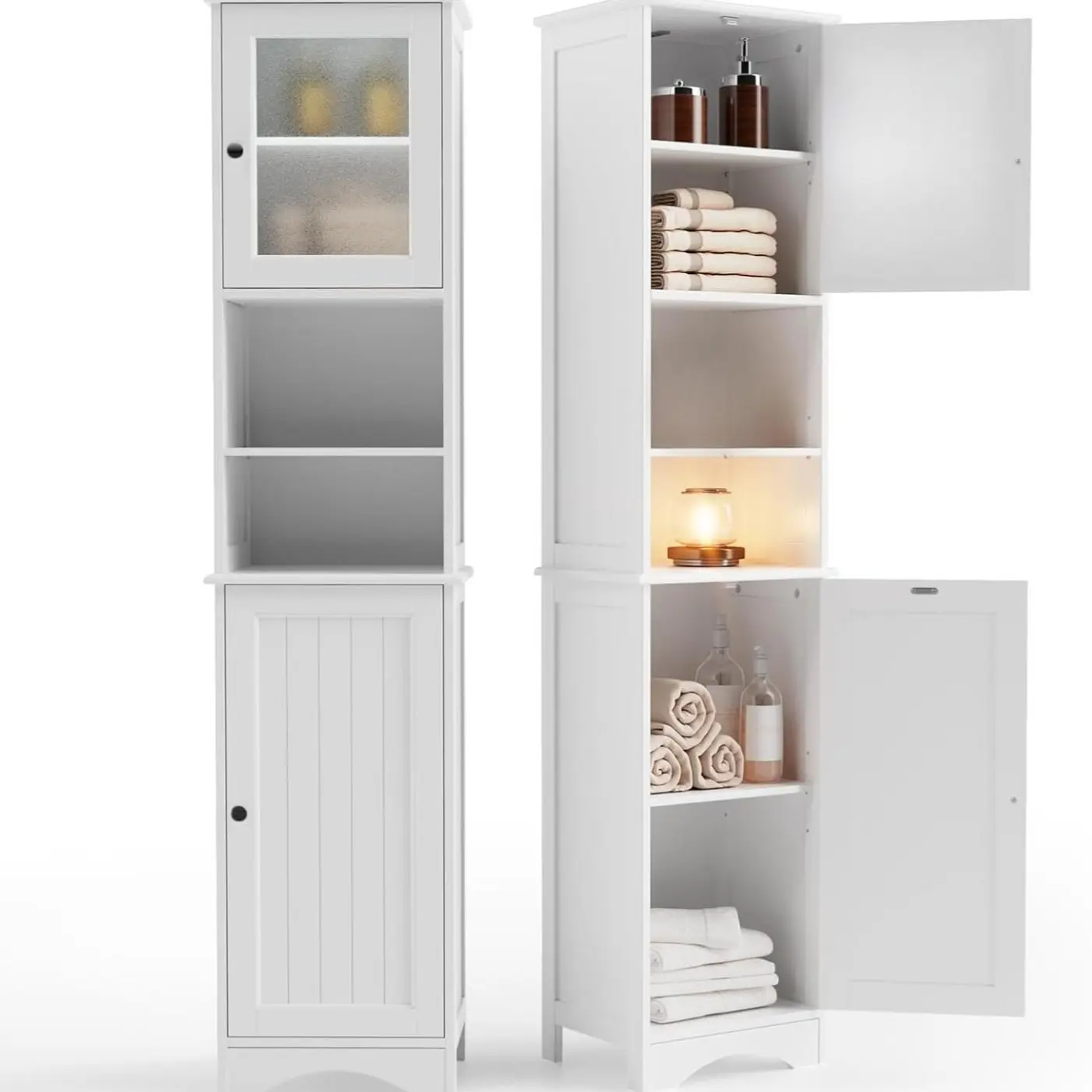 ·Tall Linen Tower Design: This storage rack optimizes your space while maintaining a compact footprint. Its elegant white finish embodies mid-century modern style, and the frosted glass cabinet door allows you to easily view the items inside