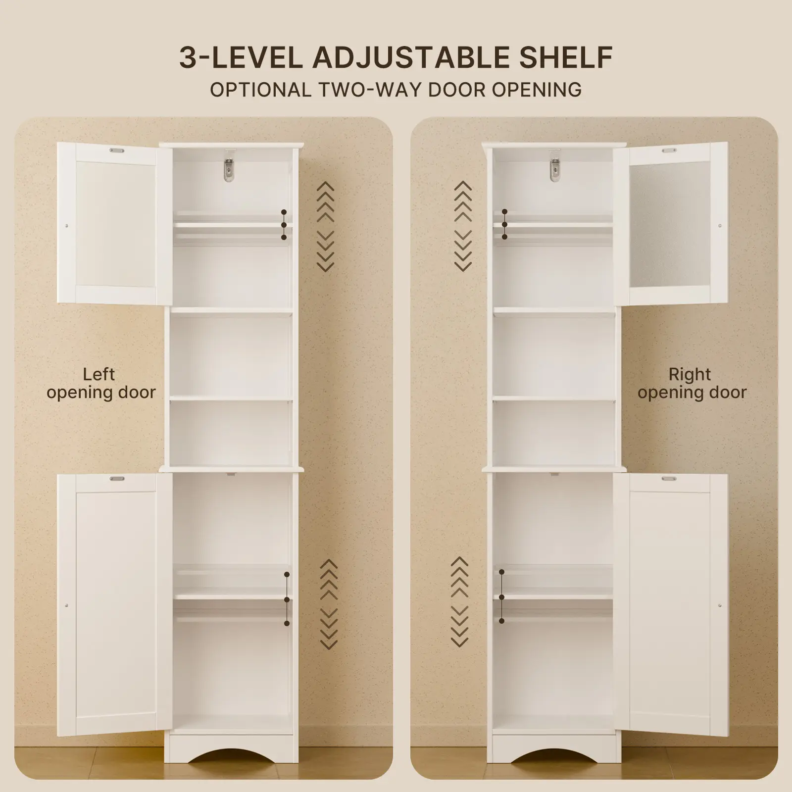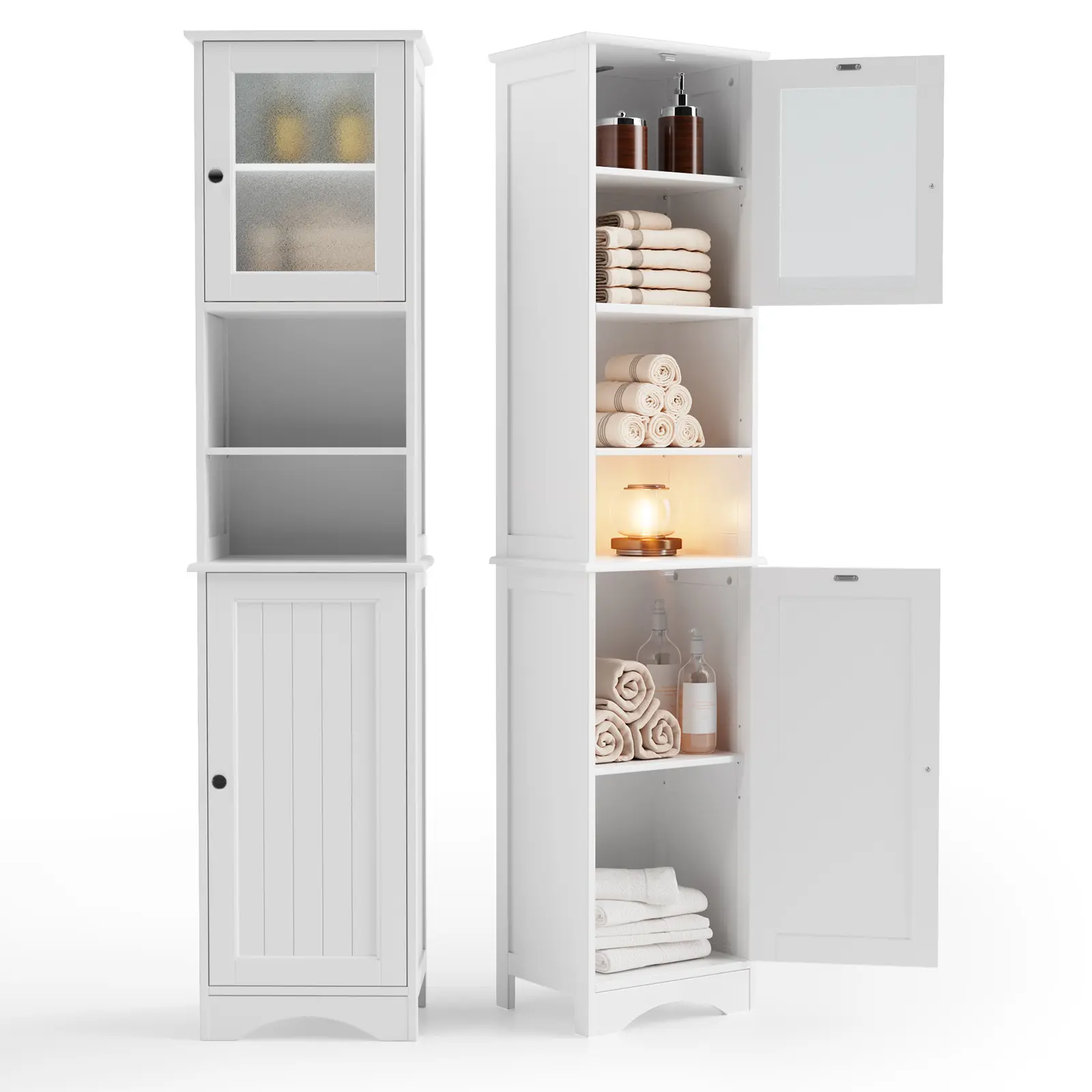 ·Tall Linen Tower Design: This storage rack optimizes your space while maintaining a compact footprint. Its elegant white finish embodies mid-century modern style, and the frosted glass cabinet door allows you to easily view the items inside
