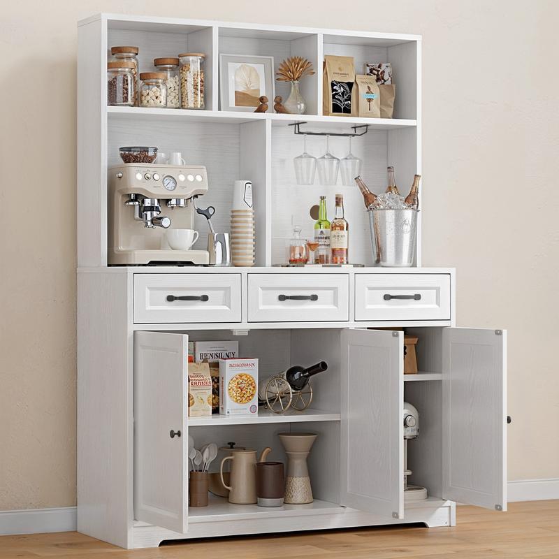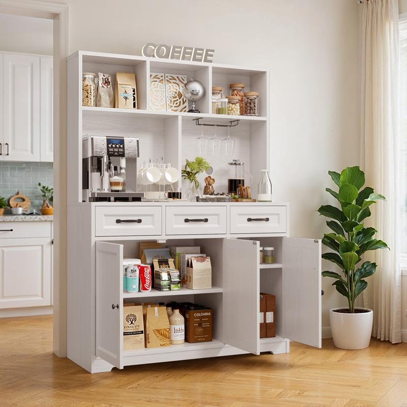 ·Ample Storage: Tall coffee bar cabinet keep your kitchen perfectly organized with multi-layer upper shelves for coffee beans, sugars, and dry goods. The lower section of the kitchen cabinet features a combination of drawers and cabinets to store dishes and larger kitchen tools. This design meets all your storage needs, ensuring a neat and clutter-free space