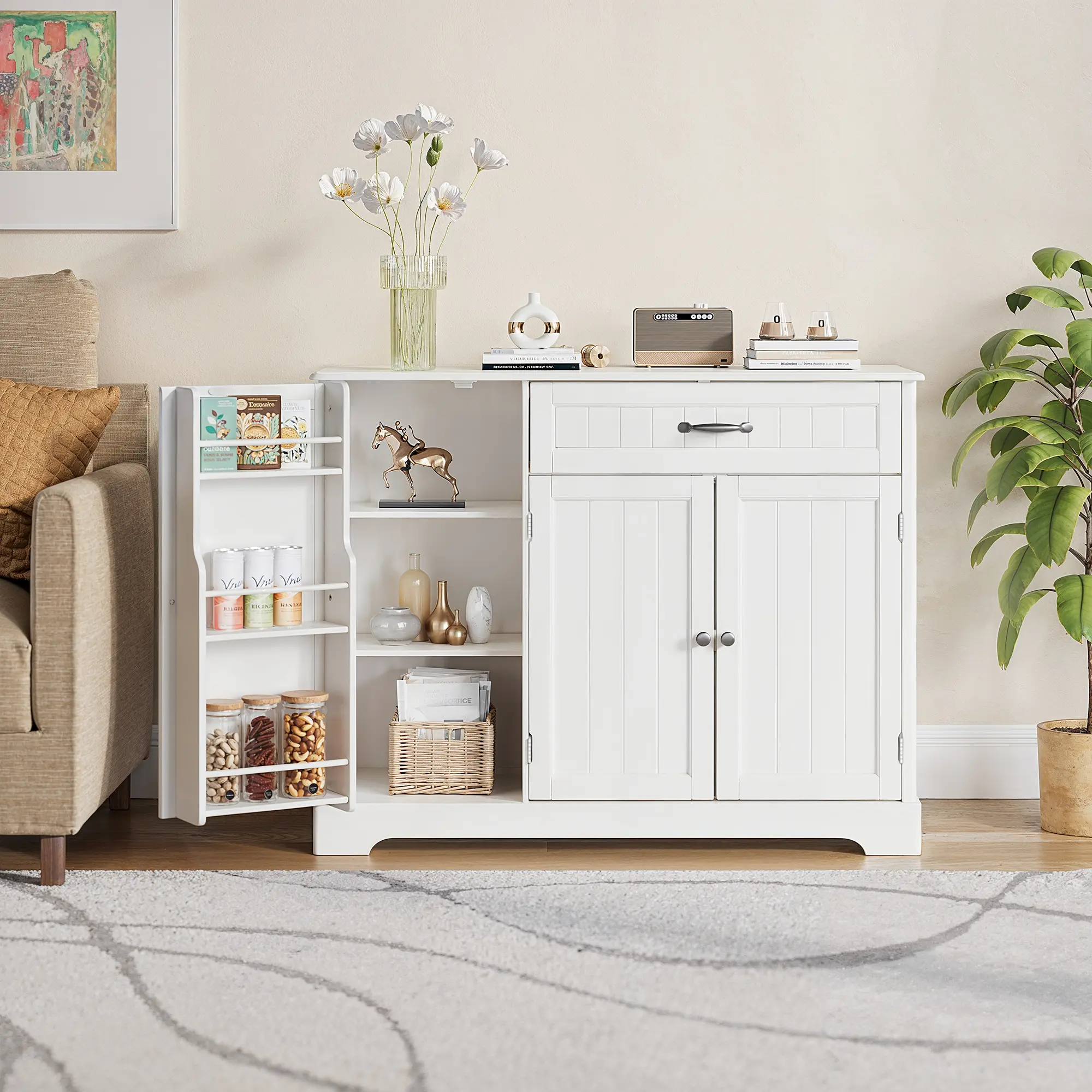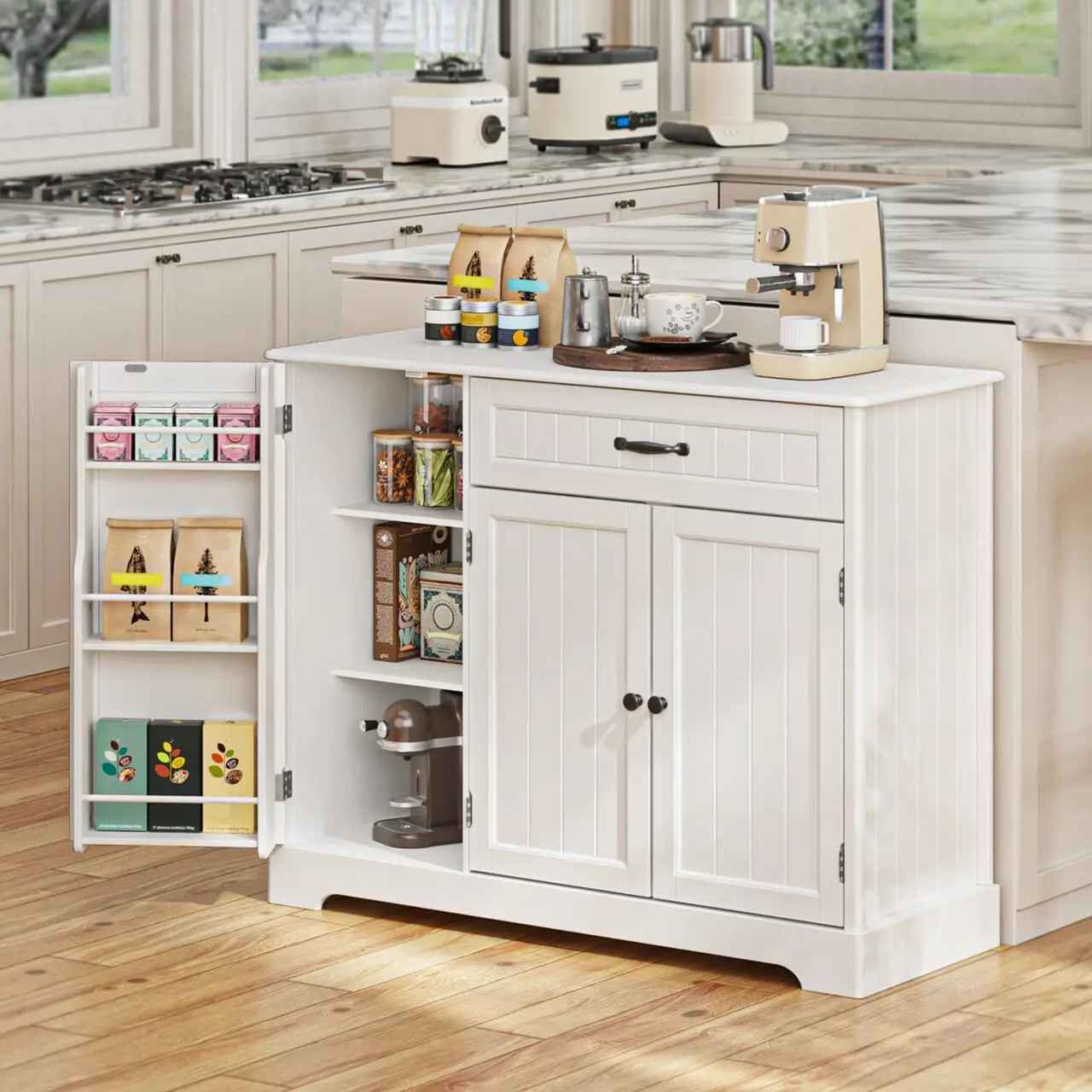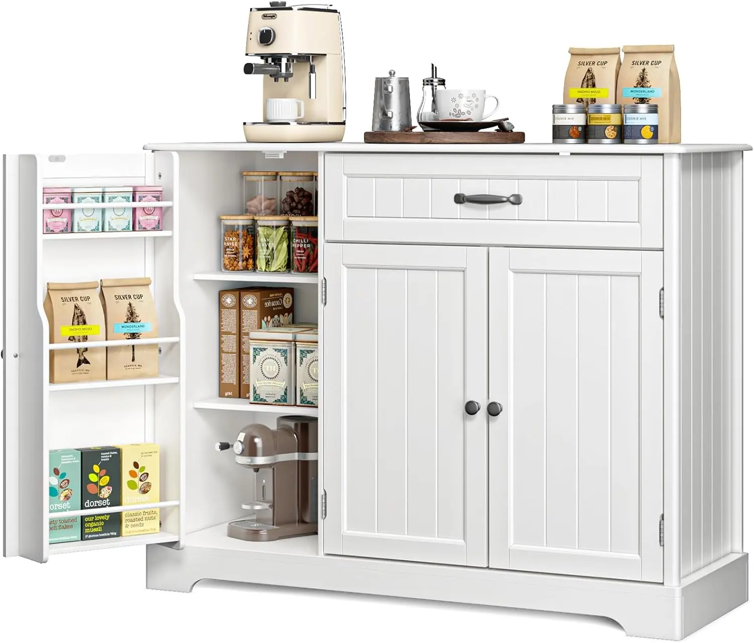 ·Special Features: This kitchen pantry cabinet comes loaded with features! The side door has three additional storage shelves inside, allowing you to customize your storage based on your needs. It serves beautifully as both a buffet sideboard and a coffee bar cabinet. Plus, it makes a lovely addition to your dining room for storing dinnerware.