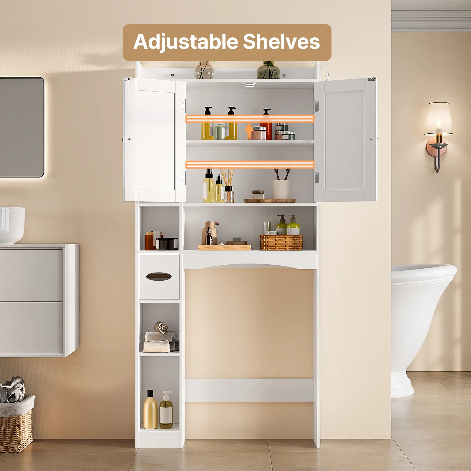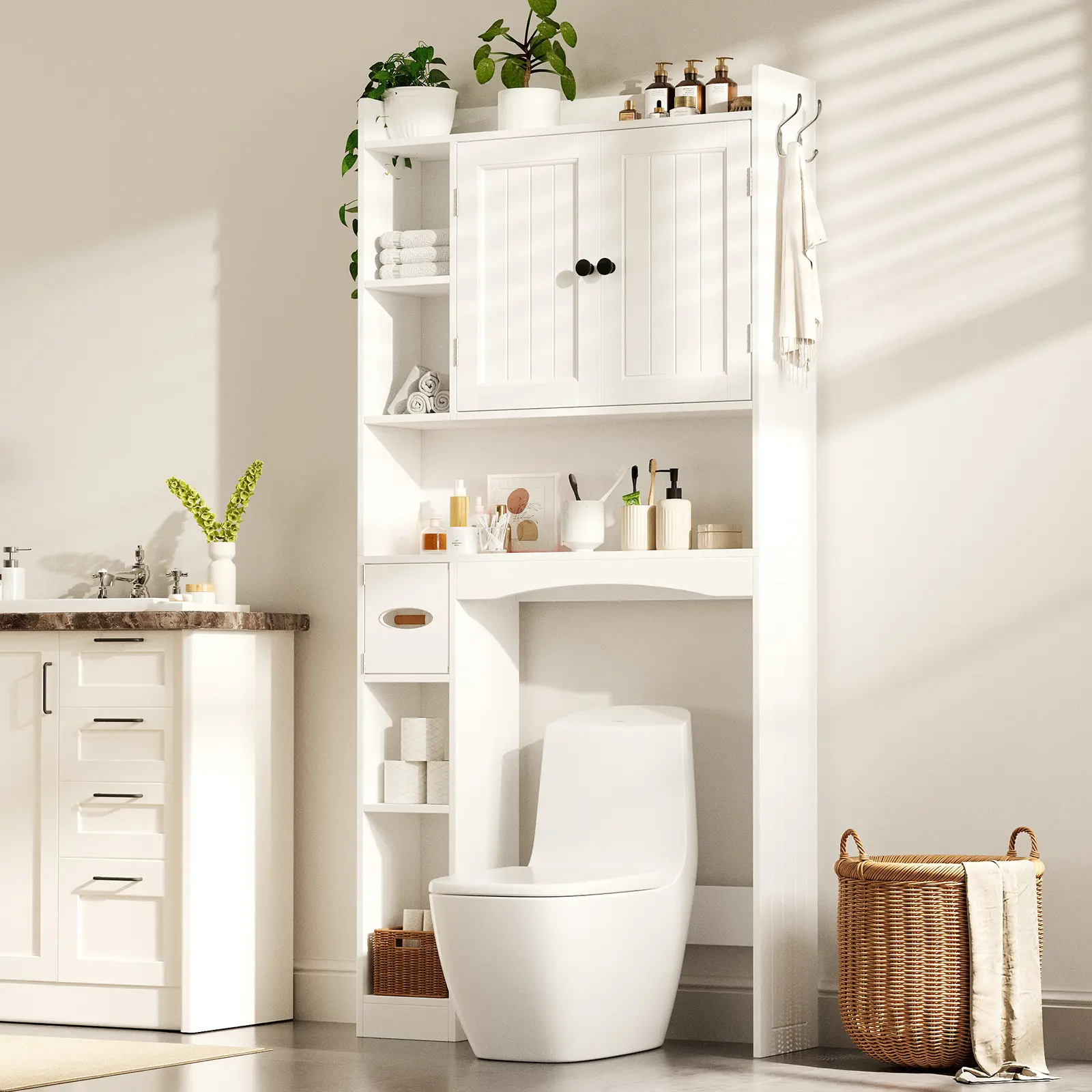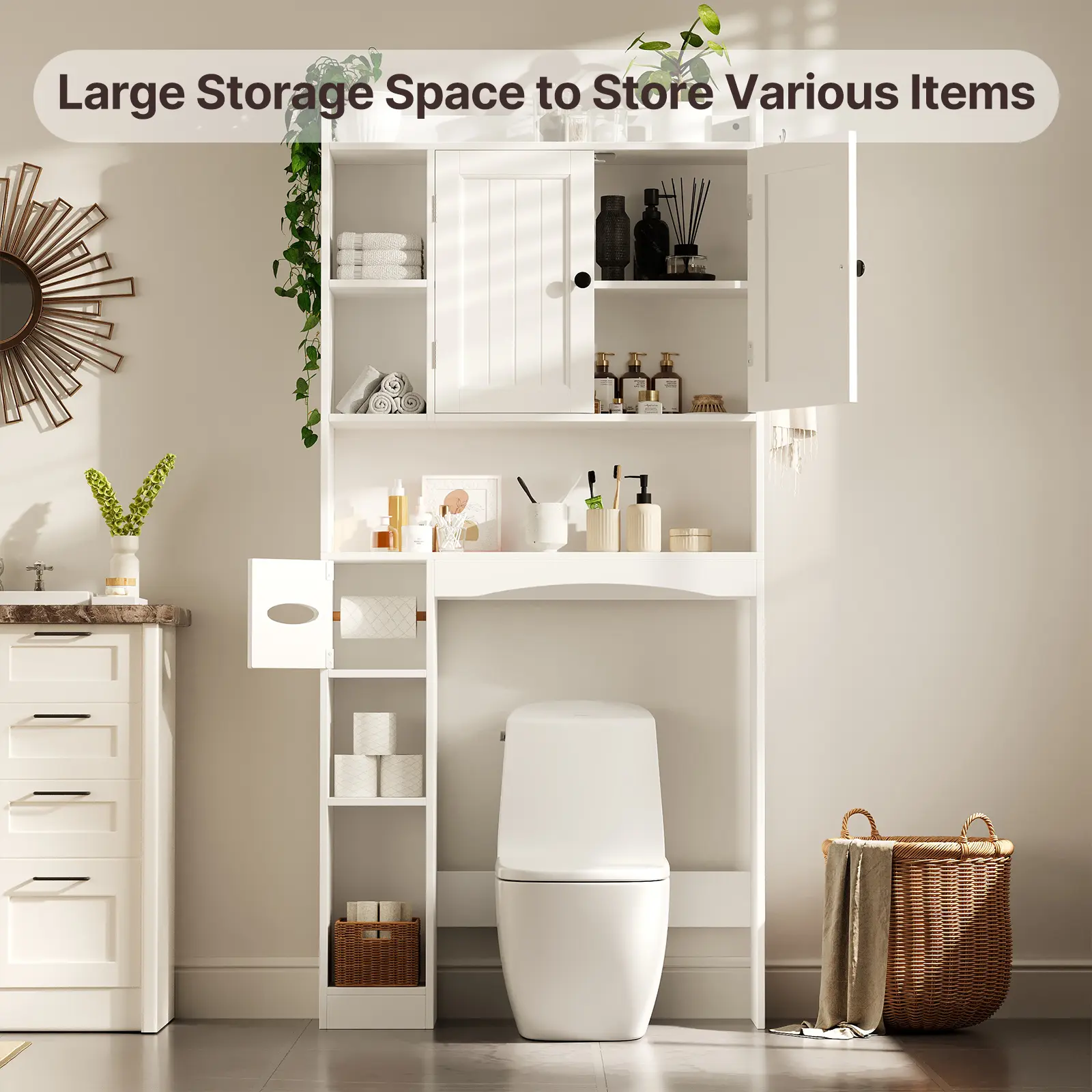 My bathroom is small and not much storage but I found this here and purchased it.i am really glad I did.not only is it beautiful it can store alot of my stuff.really happy with my purchase.