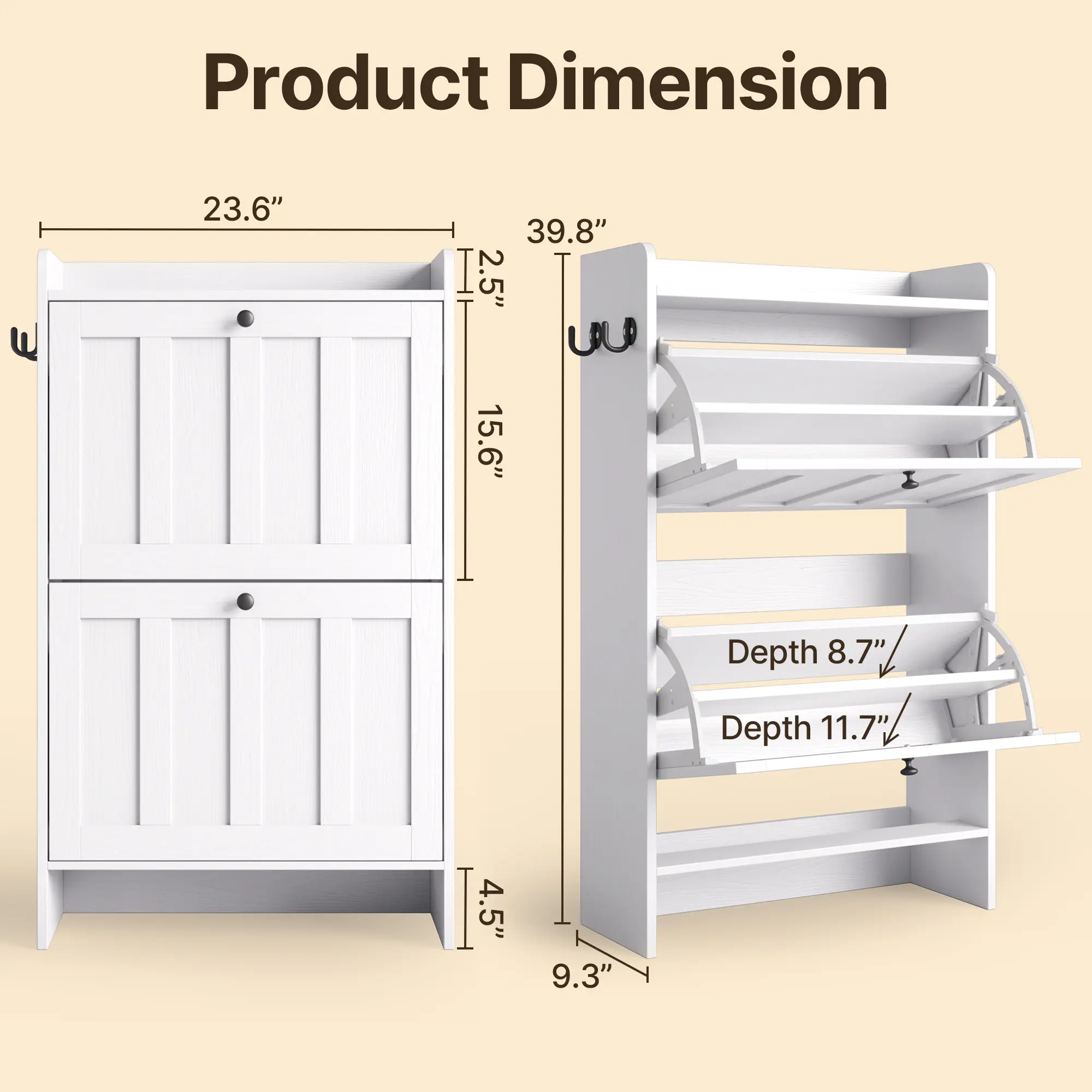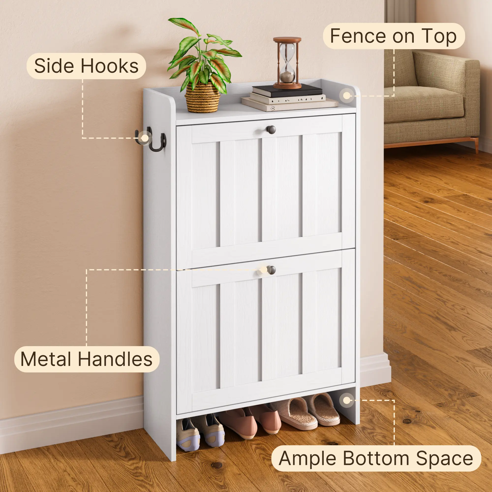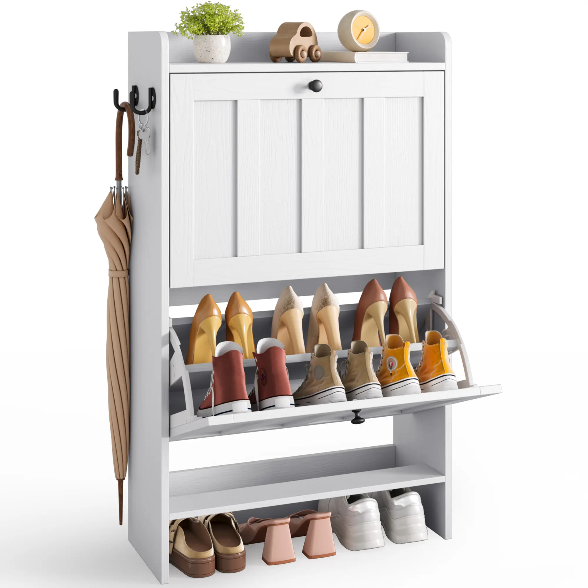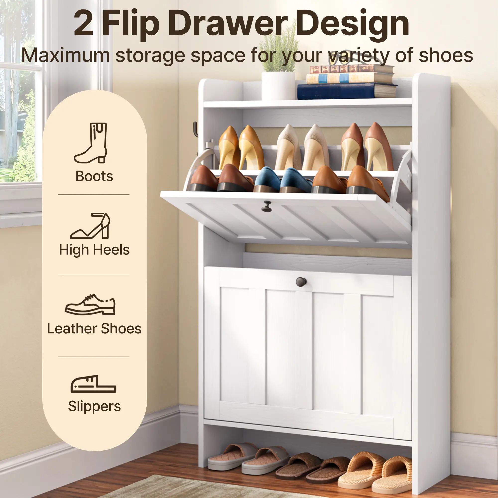 ·Large Capacity: Each flip drawer offers two-tiered compartments, accommodating flats, sneakers, heels, and kids' shoes. The open-top shelf provides quick-access storage for small items. The height of the bottom also allows you to place slippers