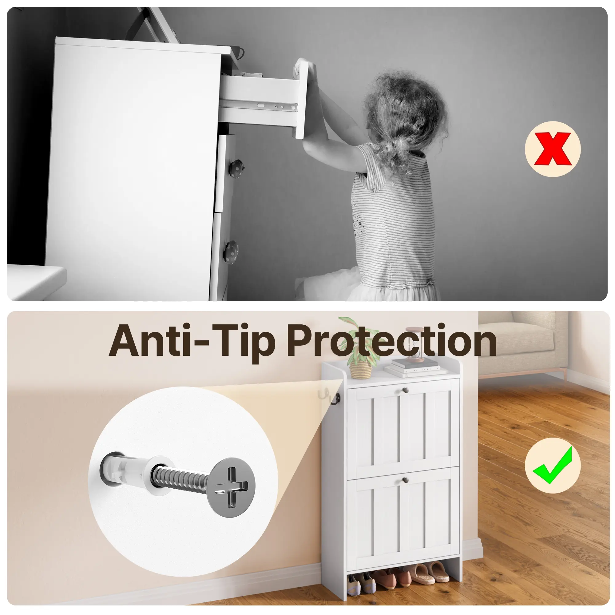 ·Safety and Durability: Includes an anti-tipping device to secure the cabinet to walls, ensuring people and pet safety in busy households. Made from MDF wood and engineered boards, it is easy to clean