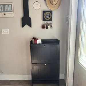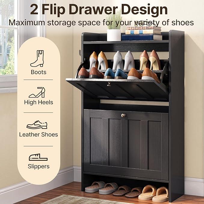 ·[Large Capacity]: Each flip drawer offers two-tiered compartments, accommodating flats, sneakers, heels, and kids' shoes. The open-top shelf provides quick-access storage for small items. The height of the bottom also allows you to place slippers