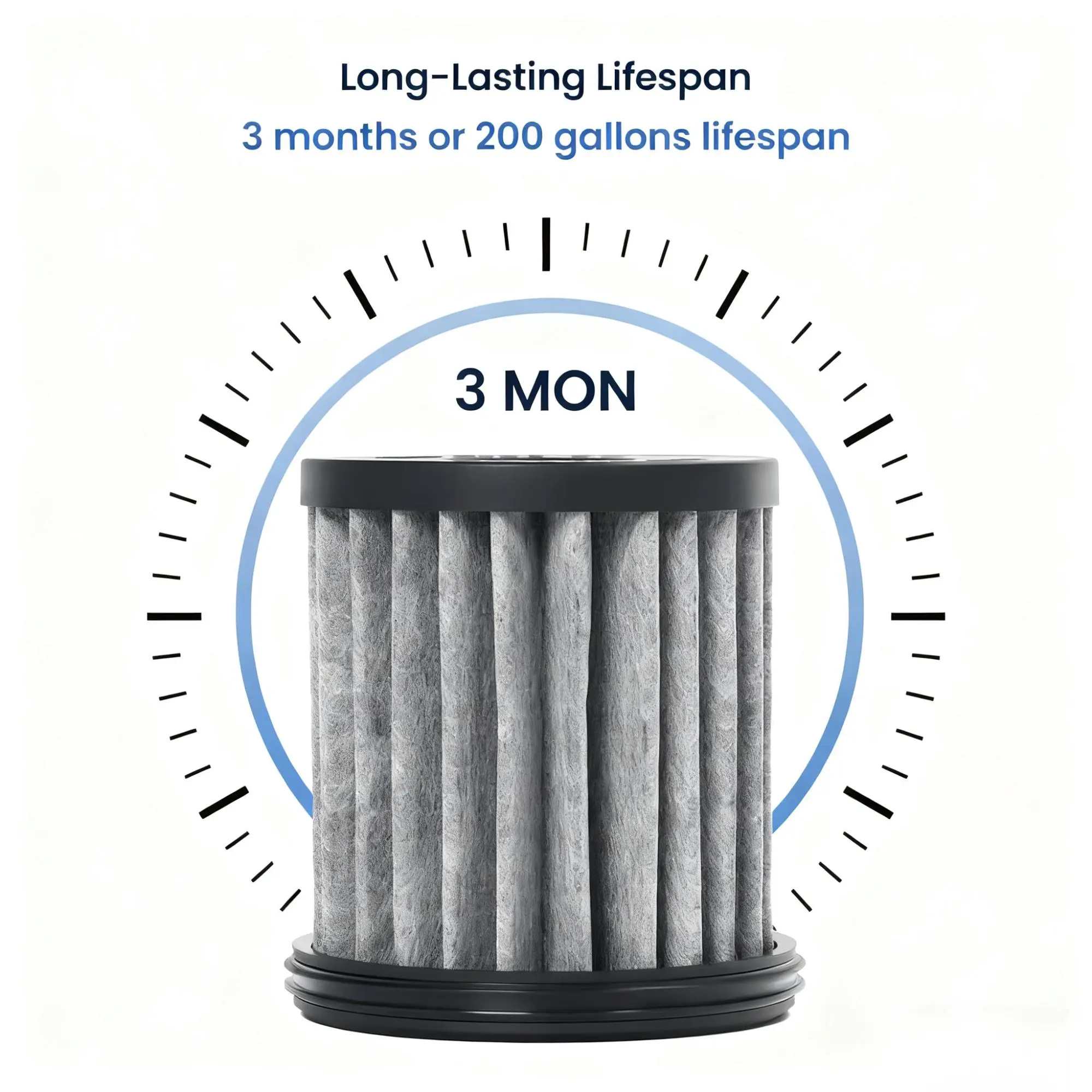 One filter cartridge provides 200 gallons of drinking water. For optimal performance, replace every 3 months. The cartridge lifespan varies based on water quality. Enjoy clean water with minimal maintenance.
