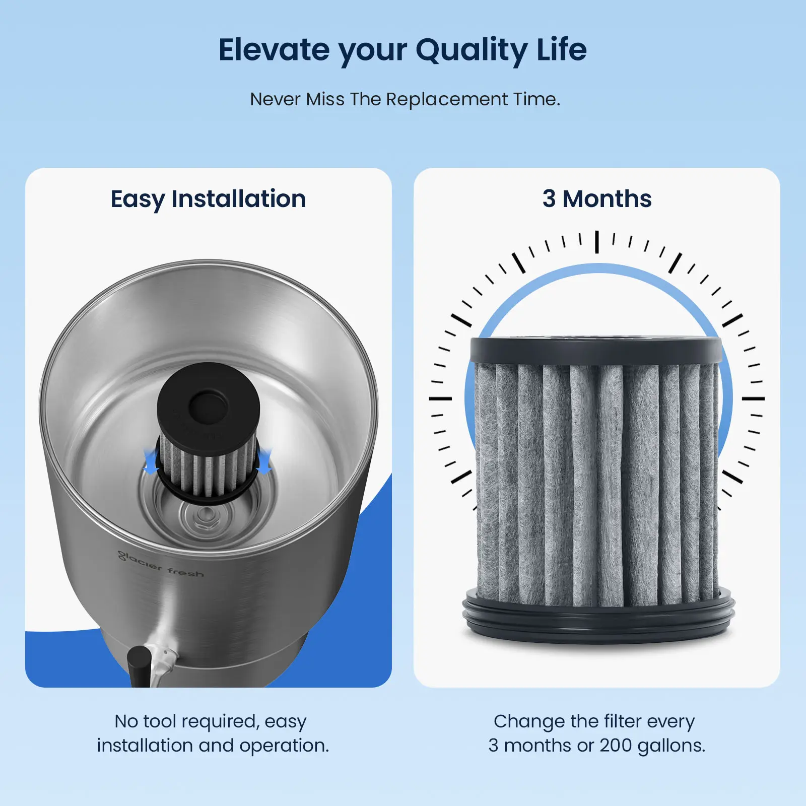 Set up and install the GLACIER FRESH system without plumbing expertise. It works without electricity, providing clean water during floods or snowstorms. Filter 2 gallons of water before first use for optimal results.