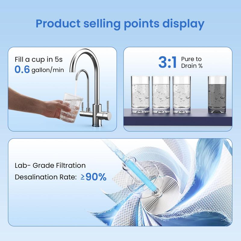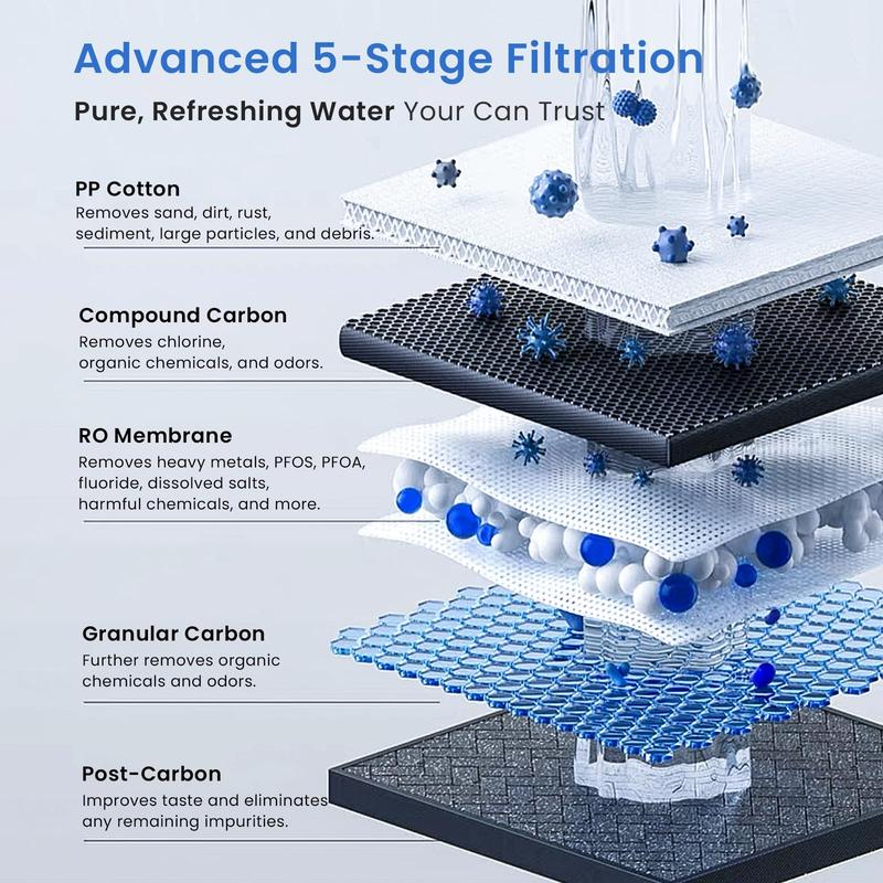This system meets NSF/ANSI 58 certification standards, ensuring safe and reliable water filtration. It effectively reduces TDS, chromium, PFAS, radium, fluoride, arsenic salt, iron, calcium, particles, chloride, chlorine, and radioactive substances. It also minimizes chemicals like vinyl chloride and ethylhexyl acrylate.