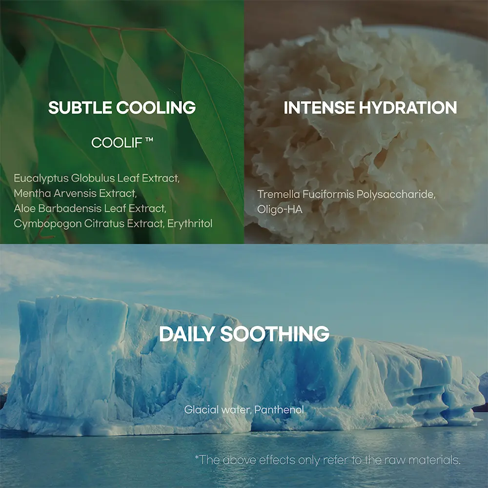 IngredientsWater/Aqua,GLYCERIN,BUTYLENE GLYCOL,1,2-HEXANEDIOL,CARBOMER,POLYGLYCERIN-3,TROMETHAMINE,EUCALYPTUS GLOBULUS LEAF EXTRACT,MENTHA ARVENSIS EXTRACT,ALOE BARBADENSIS LEAF EXTRACT,CYMBOPOGON CITRATUS EXTRACT,PANTHENOL,ETHYLHEXYLGLYCERIN,TREMELLA FUCIFORMIS POLYSACCHARIDE,HYDROLYZED HYALURONIC ACID,DISODIUM EDTA,SODIUM HYALURONATE,ERYTHRITOL