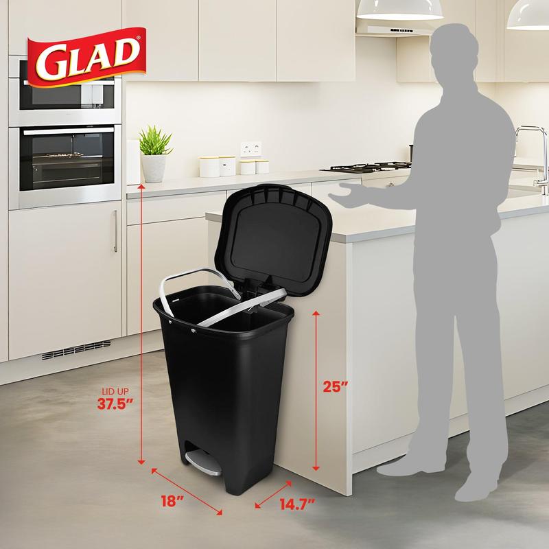 Keep your home or office clean and organized with the Glad 13-Gallon Kitchen Trash Can. Designed with a classic rectangular shape and tall, slim profile, this large-capacity waste bin is perfect for busy households, offices, or shared spaces. The durable plastic construction ensures long-lasting use while remaining lightweight and easy to maintain.This trash can features a lid formulated with Clorox Odor Protection, designed to help block and trap unwanted smells for the life of the can, keeping your space fresher and more inviting. The hands-free step pedal provides convenient, touch-free operation so you can dispose of garbage without lifting the lid or using your hands, promoting cleanliness and hygiene in your environment.The interior bag ring liner securely holds trash bags in place, preventing them from slipping or creating messy overhang. This simple but effective design detail ensures your garbage stays contained while maintaining a neat, clutter-free appearance.Measuring 14.7"L x 18"W x 25"H, this slim-profile trash can fits neatly against walls, cabinets, or in tight spaces without taking up unnecessary room. With a 50-liter capacity, this versatile kitchen trash can from Glad is ideal for kitchens, bathrooms, offices, and commercial settings where a reliable and odor-blocking waste solution is essential.