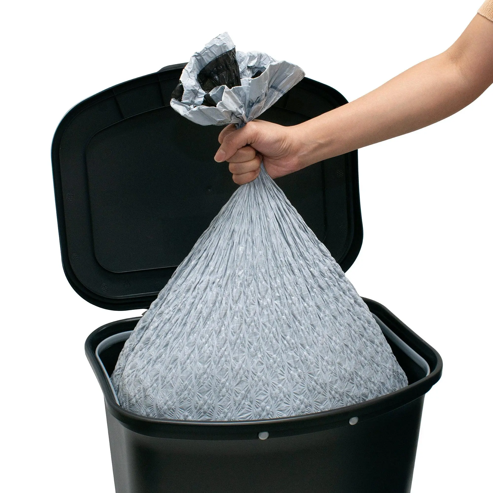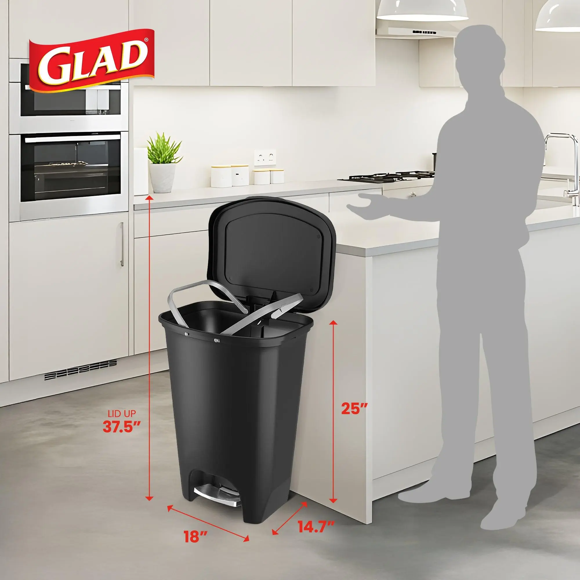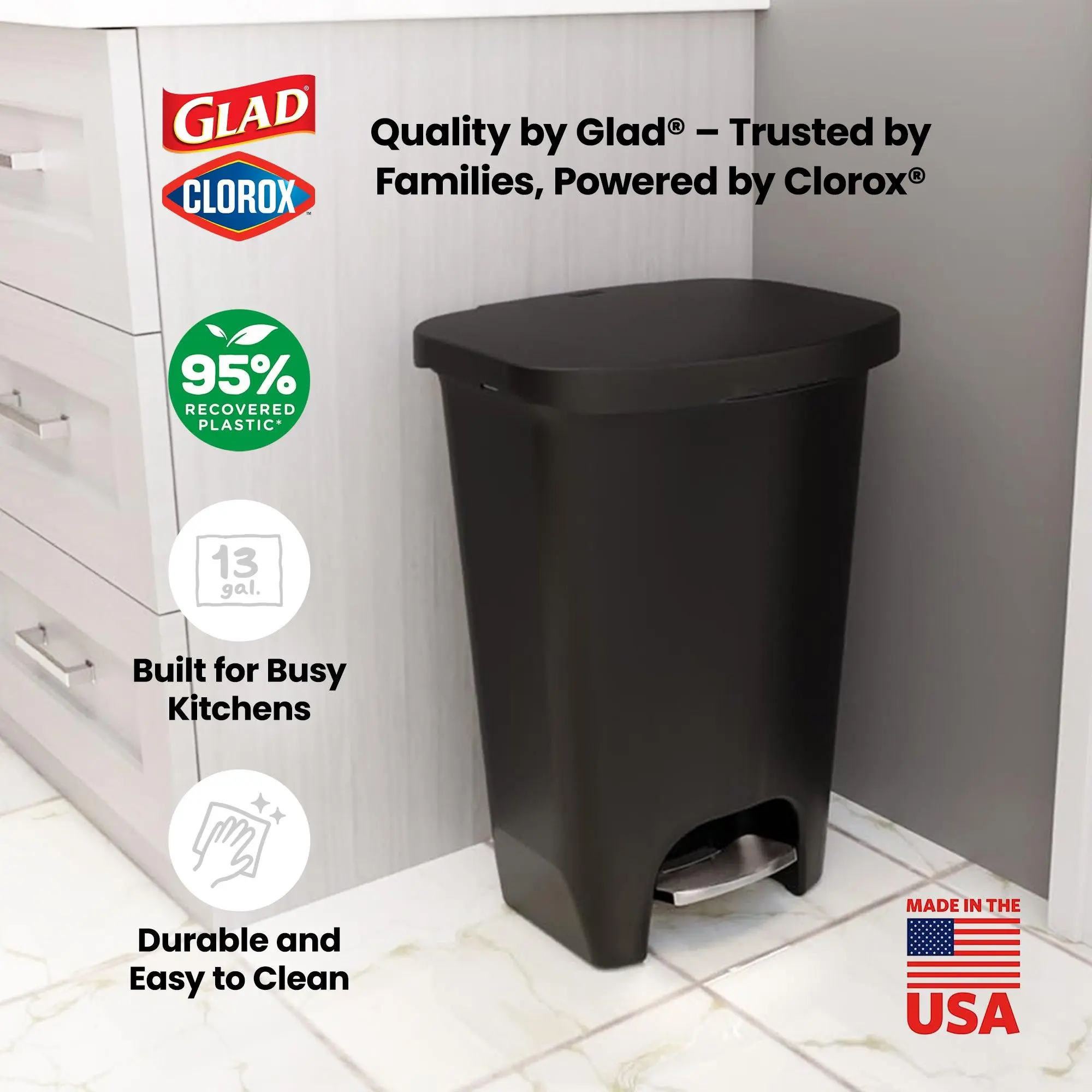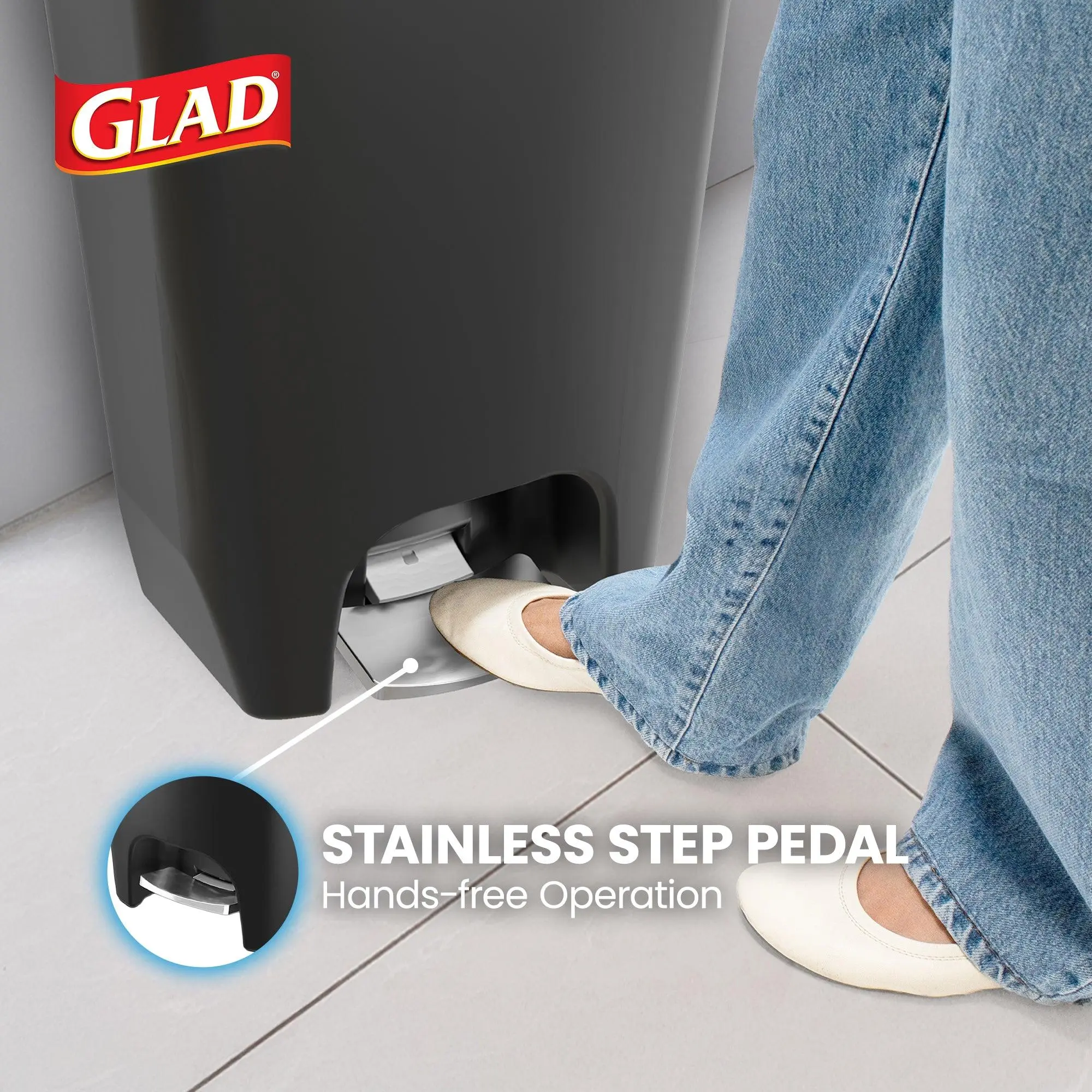 Keep your home or office clean and organized with the Glad 13-Gallon Kitchen Trash Can. Designed with a classic rectangular shape and tall, slim profile, this large-capacity waste bin is perfect for busy households, offices, or shared spaces. The durable plastic construction ensures long-lasting use while remaining lightweight and easy to maintain.This trash can features a lid formulated with Clorox Odor Protection, designed to help block and trap unwanted smells for the life of the can, keeping your space fresher and more inviting. The hands-free step pedal is made of stainless steel for enhanced durability and provides convenient, touch-free operation so you can dispose of garbage without lifting the lid or using your hands, promoting cleanliness and hygiene in your environment.The interior bag ring liner securely holds trash bags in place, preventing them from slipping or creating messy overhang. This simple but effective design detail ensures your garbage stays contained while maintaining a neat, clutter-free appearance.Measuring 14.7"L x 18"W x 25"H, this slim-profile trash can fits neatly against walls, cabinets, or in tight spaces without taking up unnecessary room. With a 50-liter capacity, this versatile kitchen trash can from Glad is ideal for kitchens, bathrooms, offices, and commercial settings where a reliable and odor-blocking waste solution is essential.
