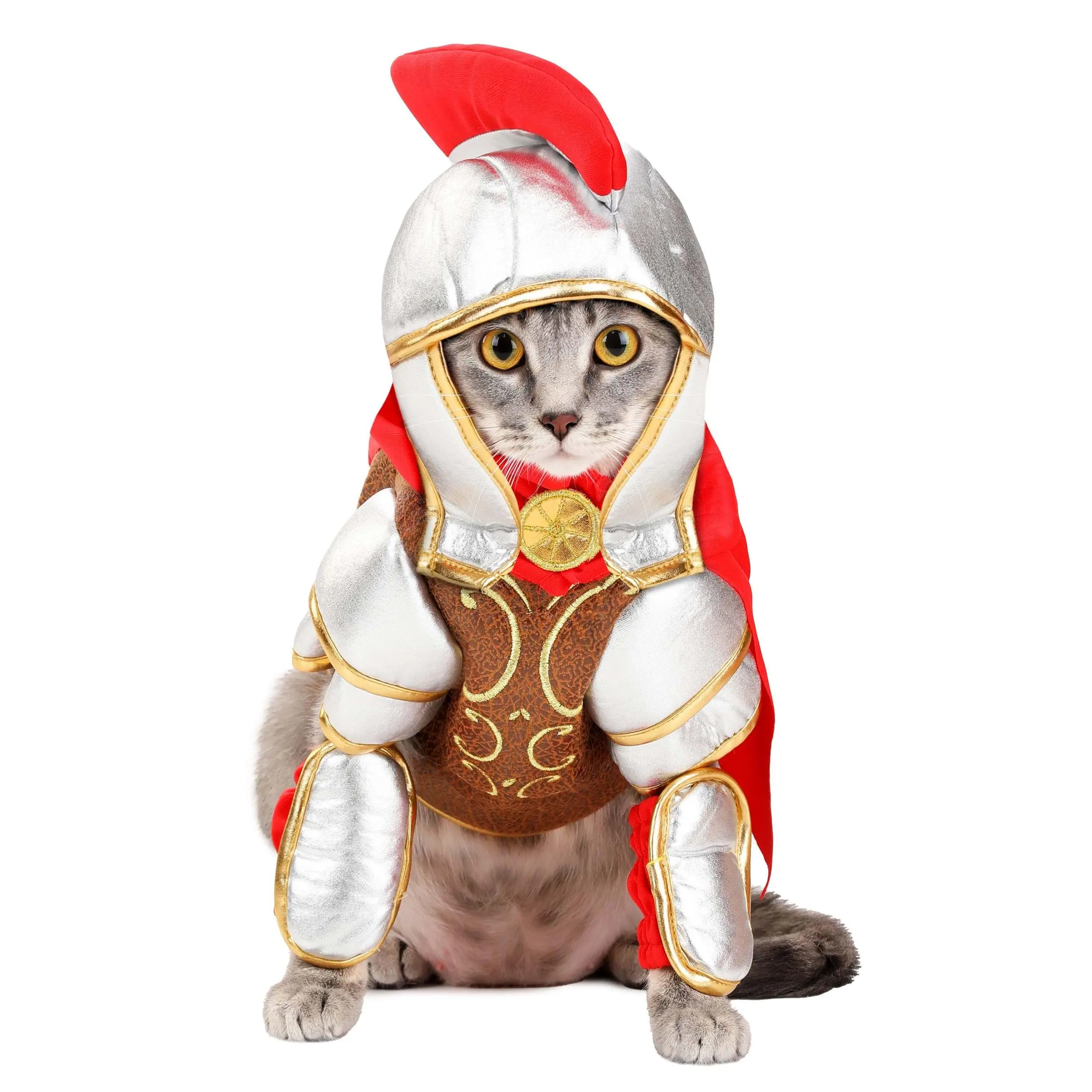 Dress your furry warrior in this epically hilarious Gladiator Costume for Dogs! The exclusive outfit slips on over your pup's front legs and fastens alont his or her back. The chest and back are made of foam-backed brown faux leather that's decorated with embroidered gold swirls, while the sleeves are made of metallic silver material. Matching silver-tone gauntlets with elastic edges slip over your dog's front legs. The red jersey-knit cape is sewn in place at the neckline and decorated with a gold-tone medallion. The foam-backed helmet has a red crest and stays in place with an elastic cord.