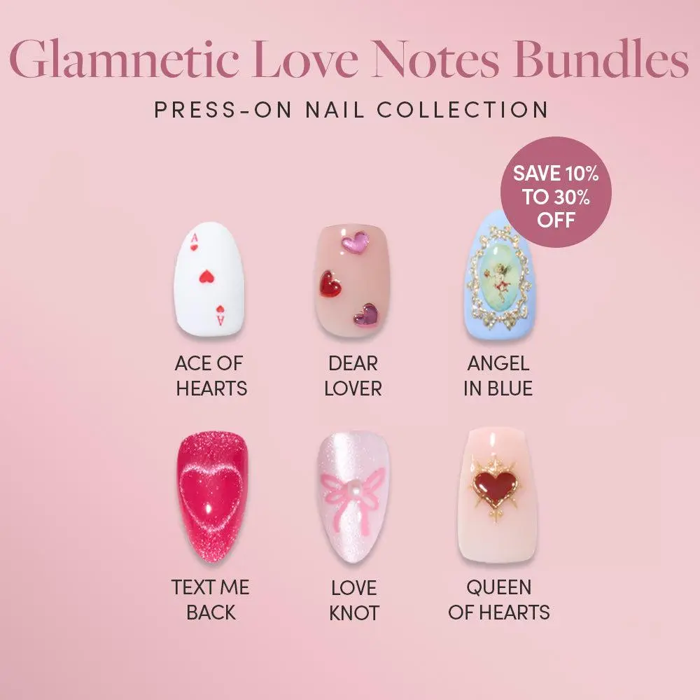 Experience the ultimate romance edit with the Glamnetic Love Notes Press-On Nail Bundle Collection, a complete universe of soft, playful, and trend-forward press-on nails. This curated selection brings together every mood, finish, and shape—from chic almonds to elegant ovals, playful squovals, and super-short silhouettes—so you can switch up your look anytime.Each bundle within the collection celebrates a different facet of love: soft romance, magnetic hearts, 3D details, flirty French tips, velvet textures, and bold statement colors. Designed for everyday wear or special moments, this all-in-one collection lets you mix, match, and layer your favorite styles while keeping salon-quality results at home.Included Bundles