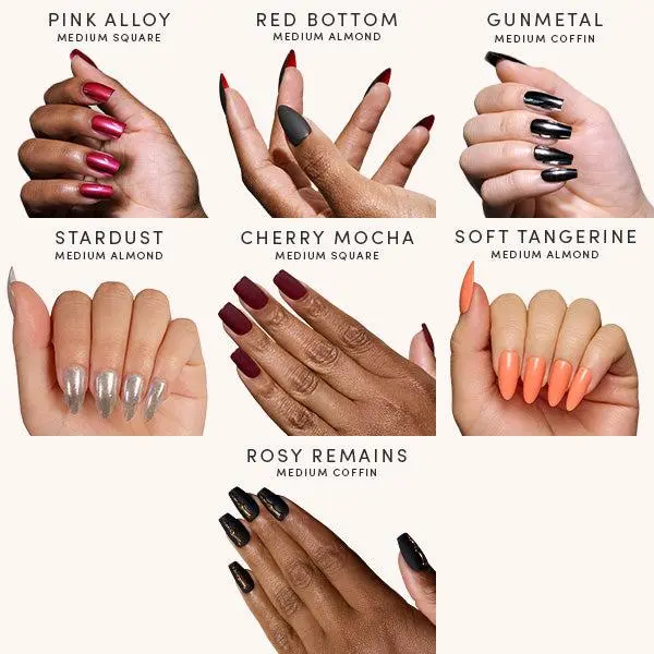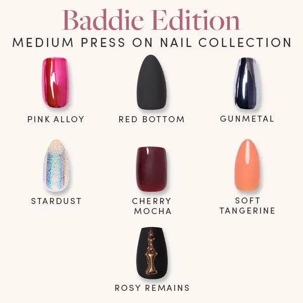 Step into your boldest era with Glamnetic’s Medium Press-On Nail Collection: Baddie Edition. Featuring striking styles, this lineup is all about fearless color, edgy art, and unapologetic glam — the ultimate nail wardrobe for every vibe.From the metallic shine of Gunmetal, the futuristic sparkle of Stardust, to the playful swirls of Pink Swirl and the fierce accents of Untamed, each set is designed to make a statement. Whether you’re going for bold brights like Pink Alloy and Soft Tangerine, or moody chic with Beetlejuice™ and Boogie Brown, these nails let you slay every look with ease.With up to 2 weeks of wear, a glossy UV-cured finish, and damage-free removal using our Glue + Remover Bundle, the Baddie Edition nails give you salon-level results in minutes — no appointment needed.✨ Key Features (All Styles)