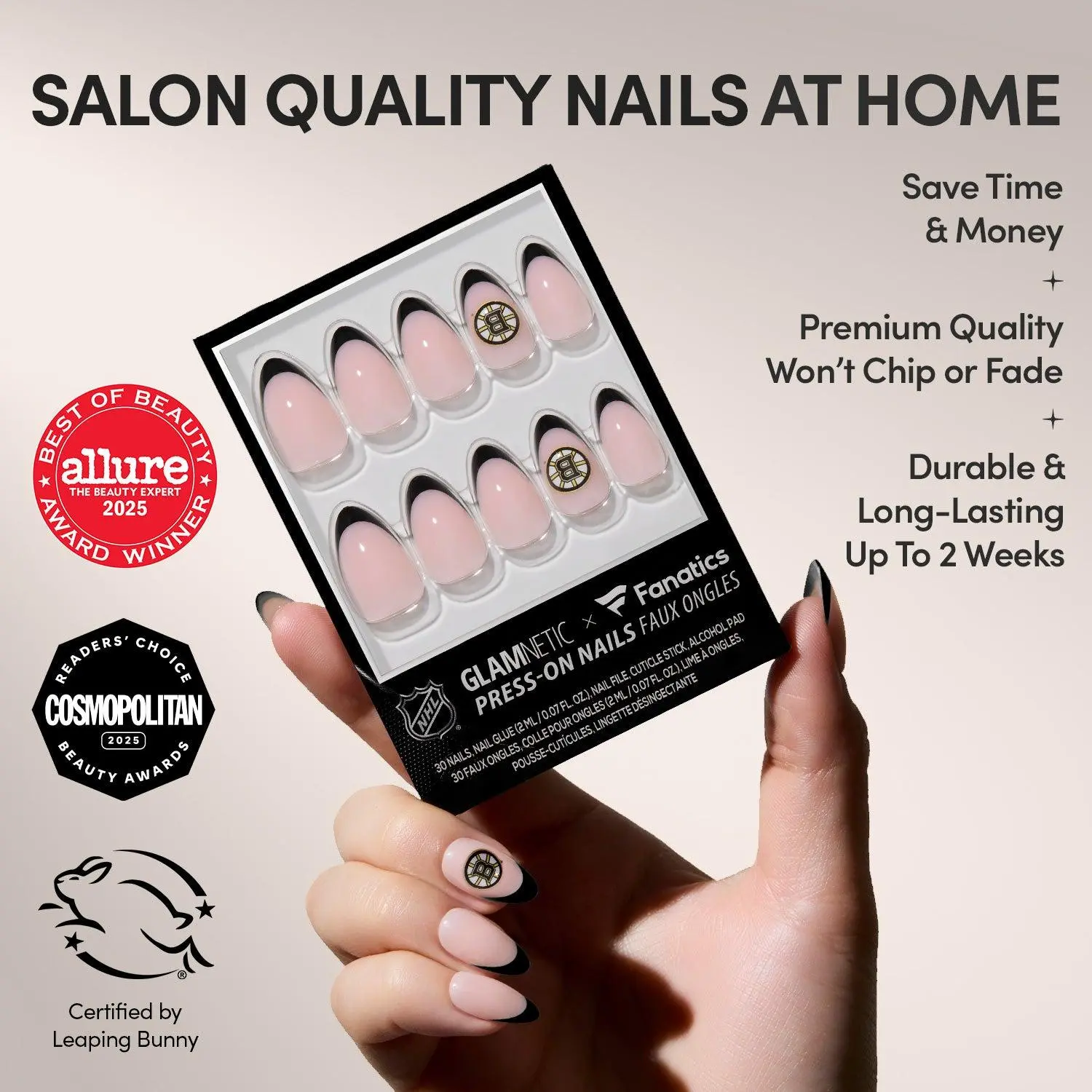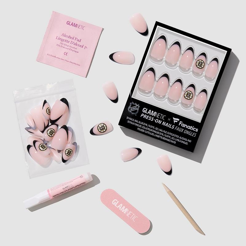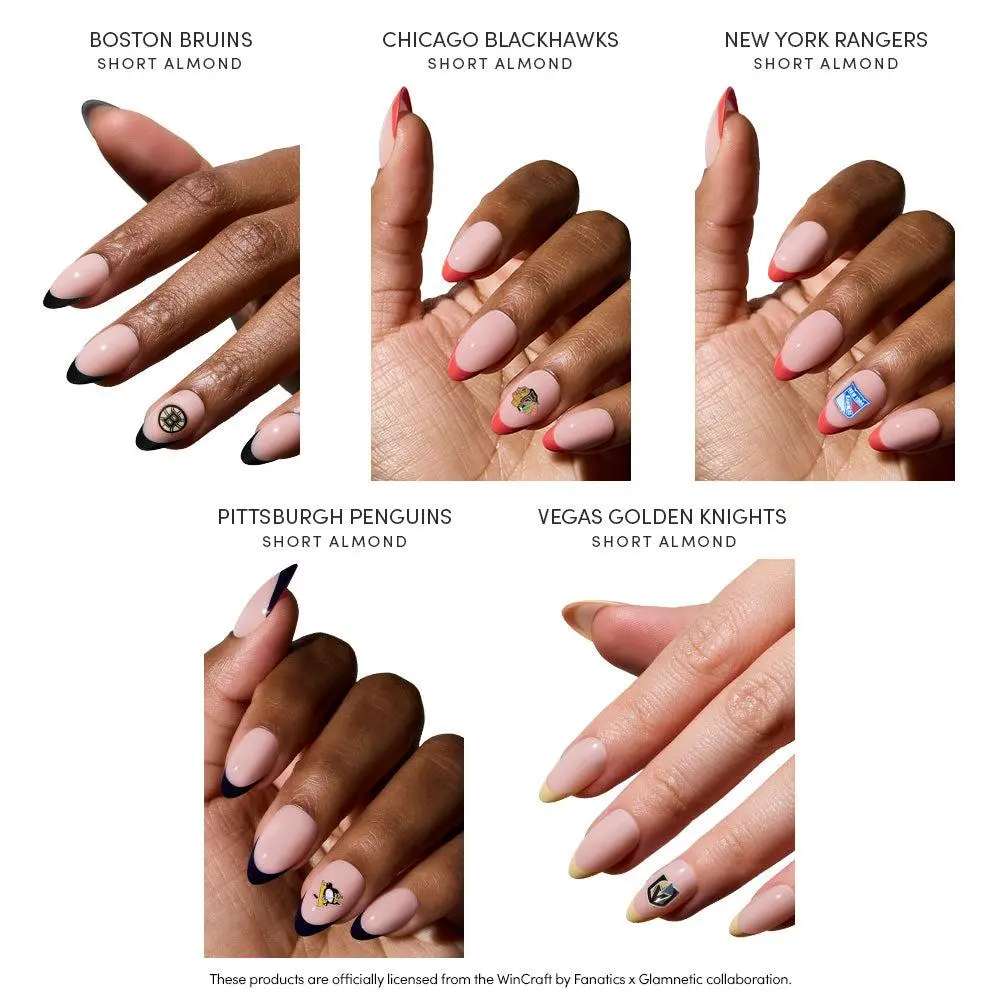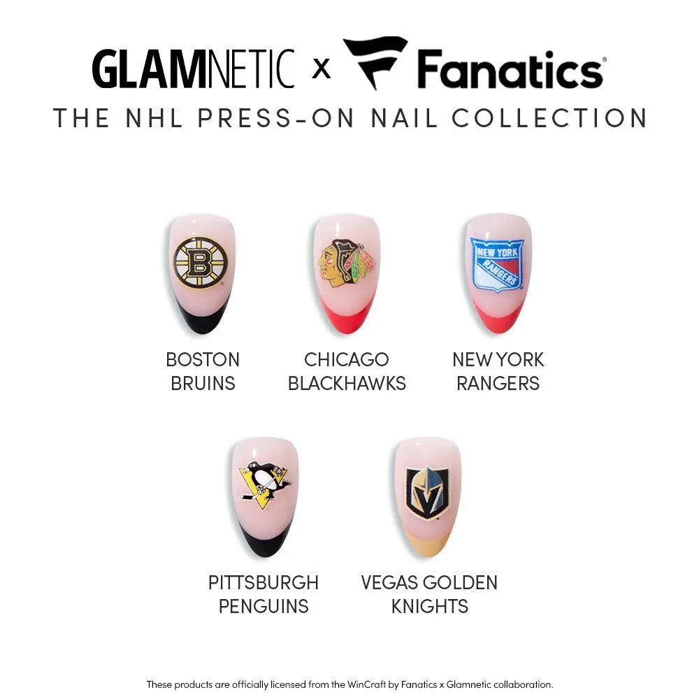 🏒 Glamnetic x Fanatics NHL Press-On Nail CollectionWhere icy style meets serious glam.Take your game day look to the next level with the limited-edition Glamnetic x Fanatics NHL Press-On Nail Collection — the ultimate fusion of fierce fandom and flawless beauty. Whether you’re heading to the arena, hosting a watch party, or cheering from the couch, these press-ons let you rep your team with next-level style.Each set features our signature French tip design paired with custom accent nails showcasing your favorite NHL team, so you can stay polished and proud through every period. 💅 Why It’s DifferentOfficial NHL Designs – Accent nails proudly feature your team’s logo in a clean, timeless French tip style.High-Gloss UV Finish – UV top coat adds chip resistance and a salon-quality shine.Waterproof + Long-Lasting – Stay flawless through every slapshot, power play, and OT win.100% Vegan & Cruelty-Free – Because glam should always be guilt-free.Customizable Fit – Made from high-quality material that’s easy to file or clip without cracking or bending.Eco-Friendly Packaging – Clear PET plastic tray is 100% recyclable. 📦 What’s Inside (Per Kit)