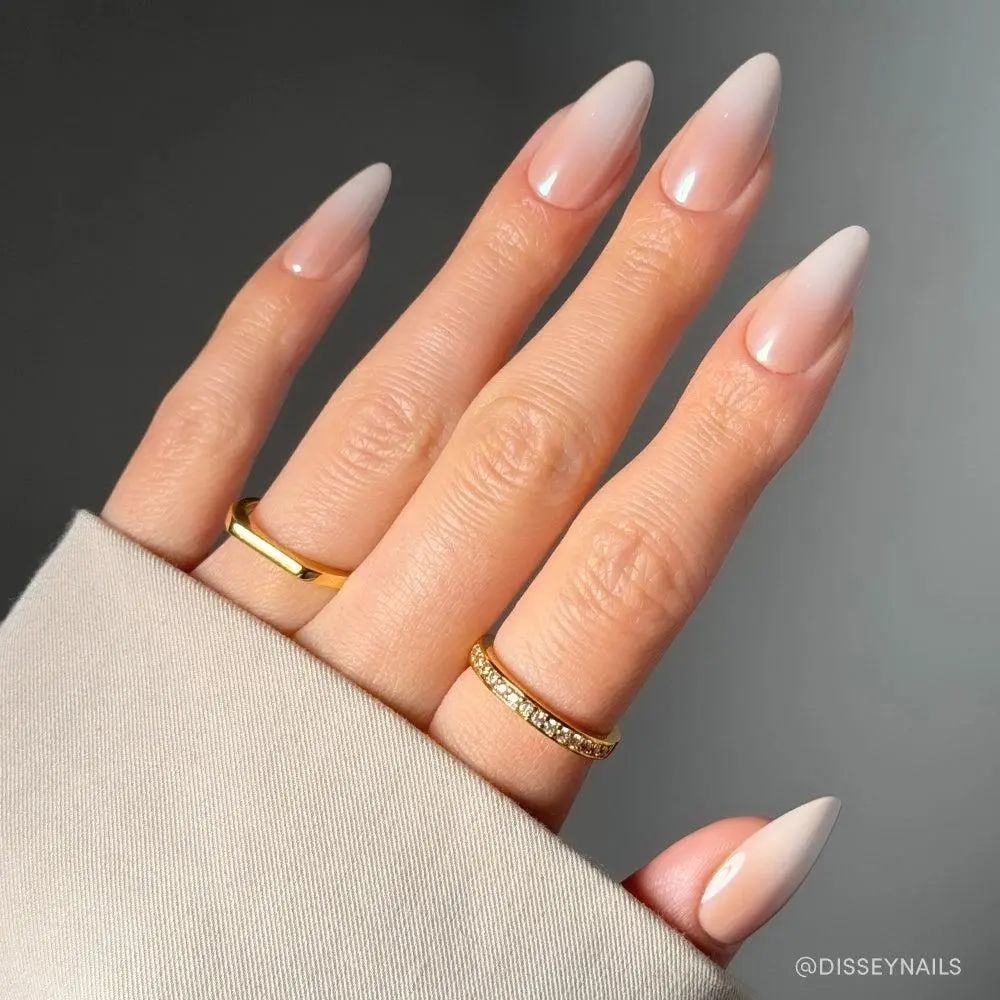 ·Frosted Chai: Medium almond press-on nails with a nude-to-white ombré and a pearlescent glossy glazed finish
