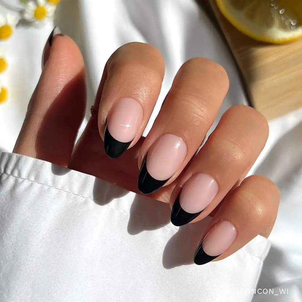·Caviar: Short almond press-on nails with black French tips and a sleek, glossy finish