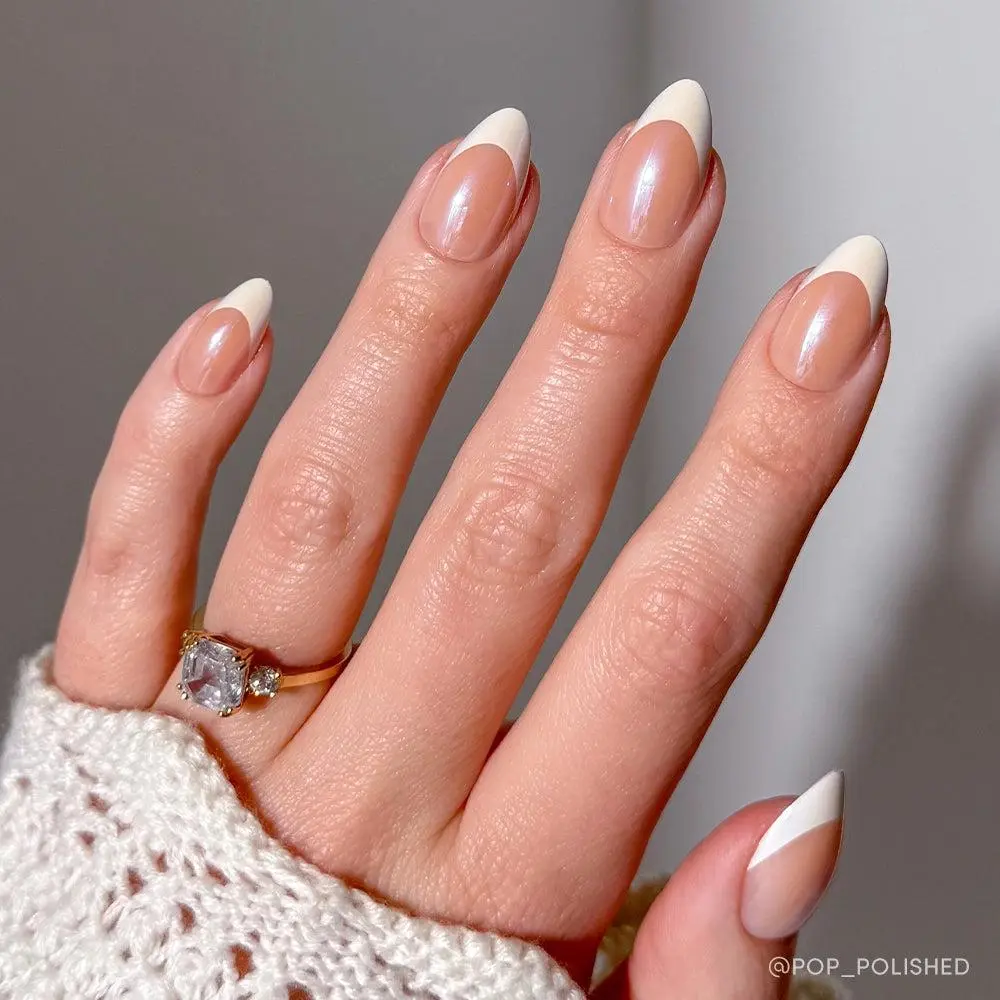 ·Fiancéd: Short almond press-on nails with a nude-to-white ombré and a pearlescent glossy glazed finish