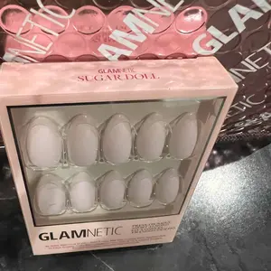 ·Sugar Doll: Short almond milky press-on nails with a soft pink, semi-transparent base and a high-gloss finish