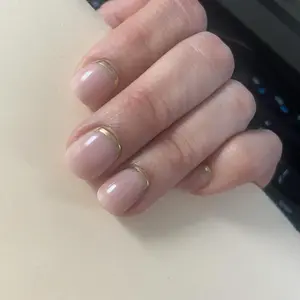 ·Goal Digger: Short round press-on nails with a sheer nude base and gold foil “reverse French tip” around the base